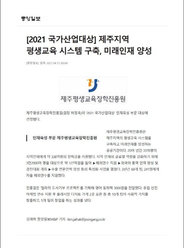 [2021 국가산업대상] 제주지역 평생교육 시스템 구축, 미래인재 양성