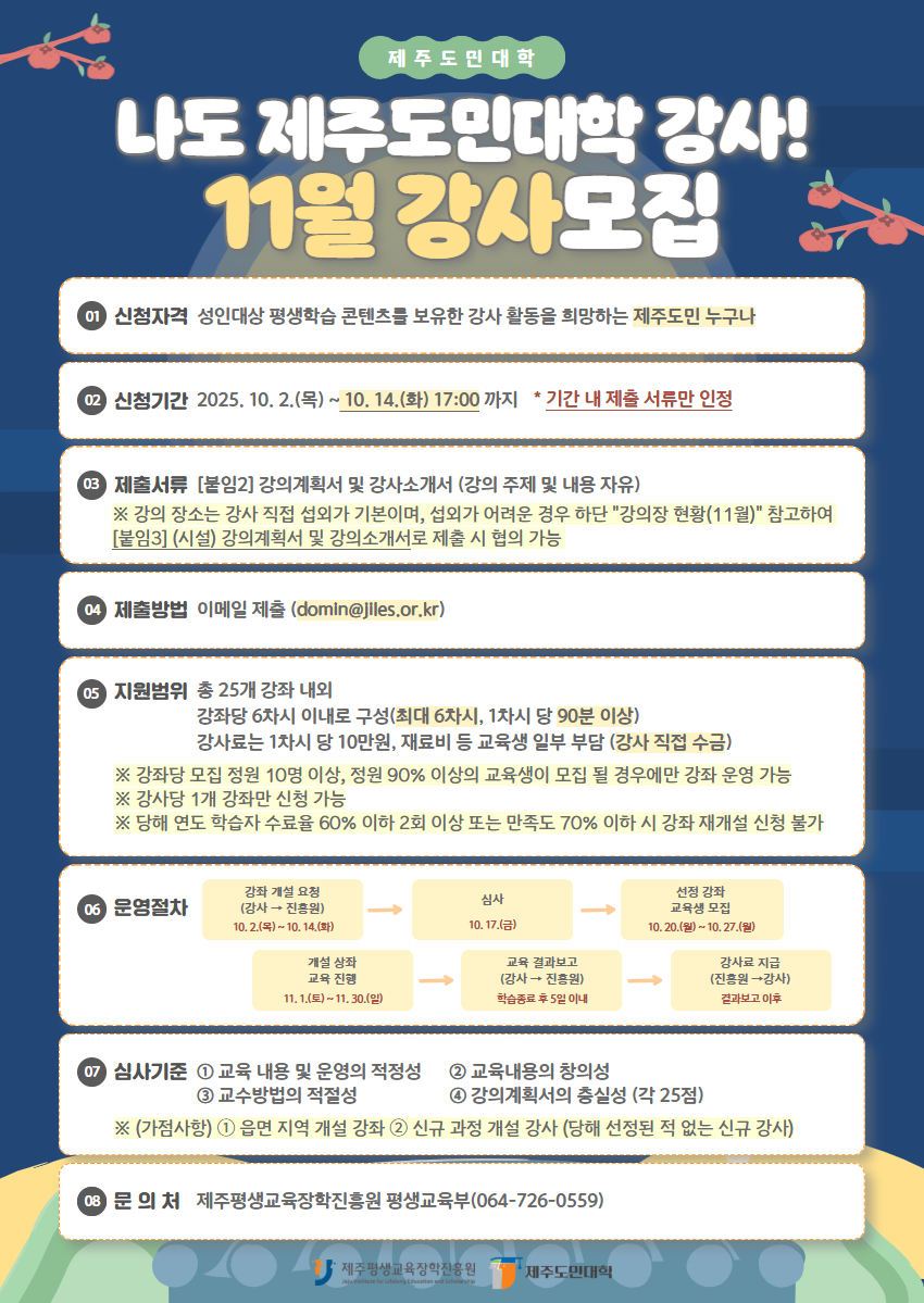 제주도민대학에서 11월 「나도 제주도민대학 강사!」 교육과정 도민 강사를 모집합니다.