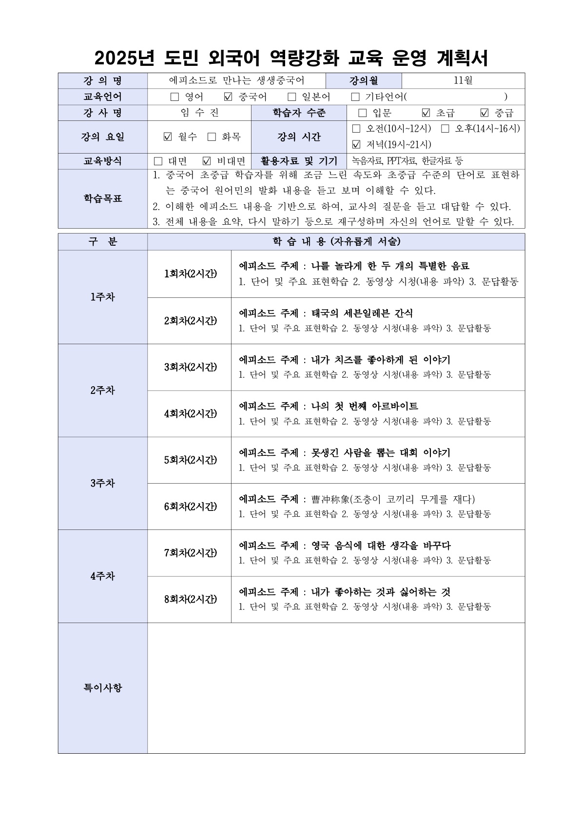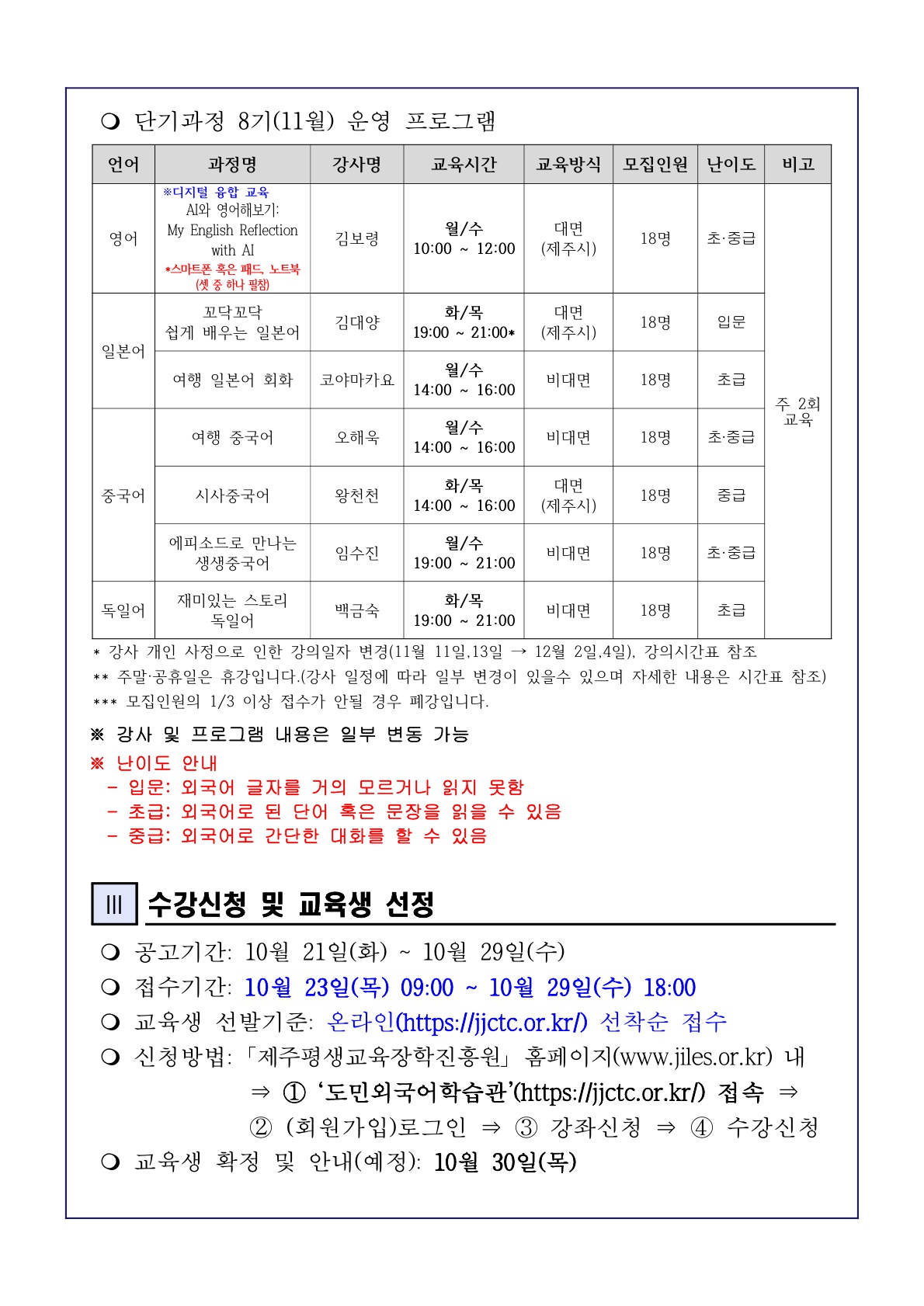 제 목 | 「2025년 특정주제.분야별 외국어 교육」 단기과정 8기(11월) 교육생 모집 | ||