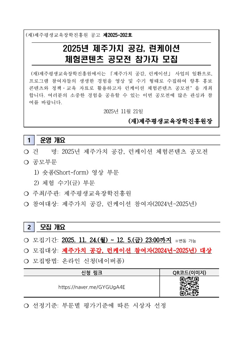 (공고문) 2025년 제주가치 공감, 런케이션 체험콘텐츠 공모전 참가자 모집.pdf (169 KBytes)