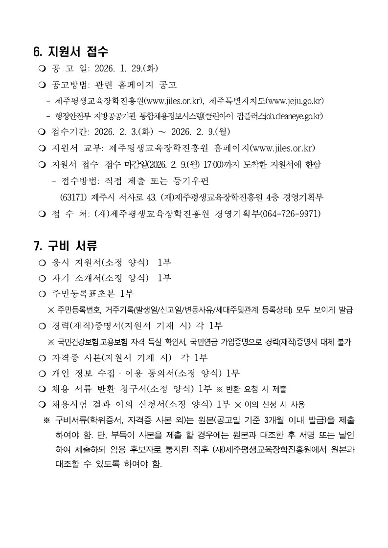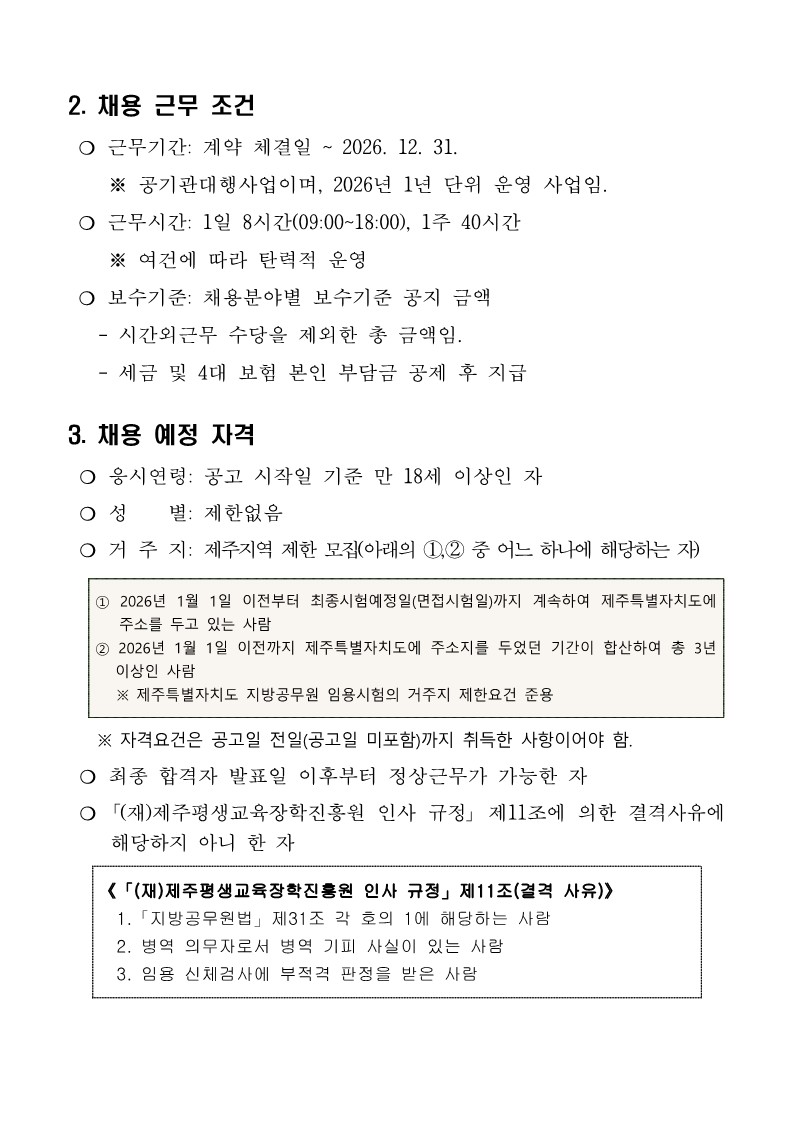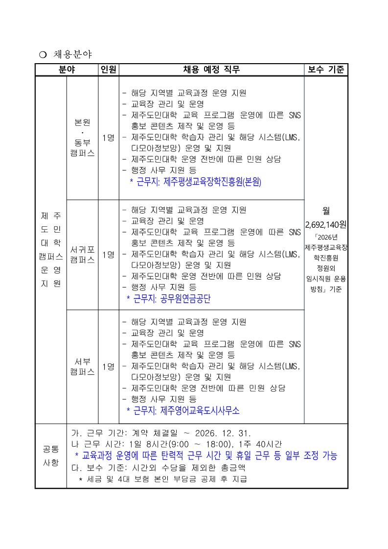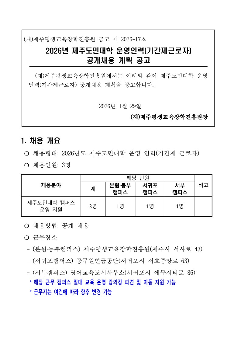 2026년 제주도민대학 운영인력(기간제근로자) 공개채용 계획 공고