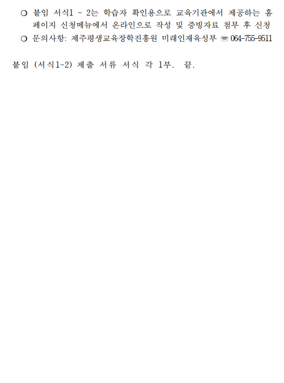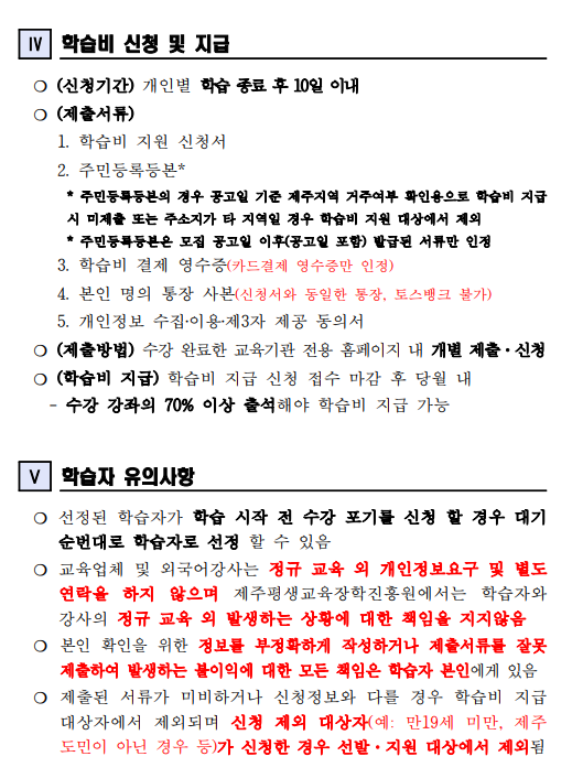 * 전화 외국어 학습비 지원은 제주평생교육장학흥원에서 지정한 교육기관에서 진행됩니다. * 선착순 모집이며, 선발자는 문자 개별 안내 예정입니다. ※ 수신거부 및 스팸처리 등으로 문자를 확인하지 못하여 발생하는 불이익에 대해서는 책임지지 않습니다. 선착순에 들었으나 문자 수신을 받지 못했을 경우(선발자 안내 이후), 미래인재육성부로 연락주시기 바랍니다. (신청하기) : 제주평생교육다모아 (damoa.jeju.kr) → 2월 11일(수)부터 신청