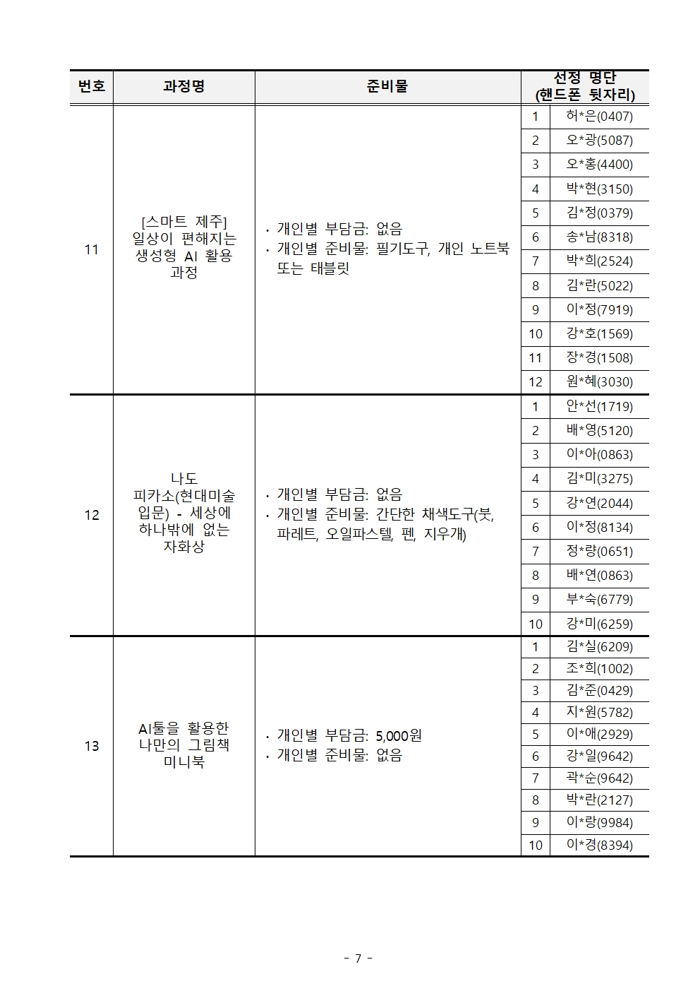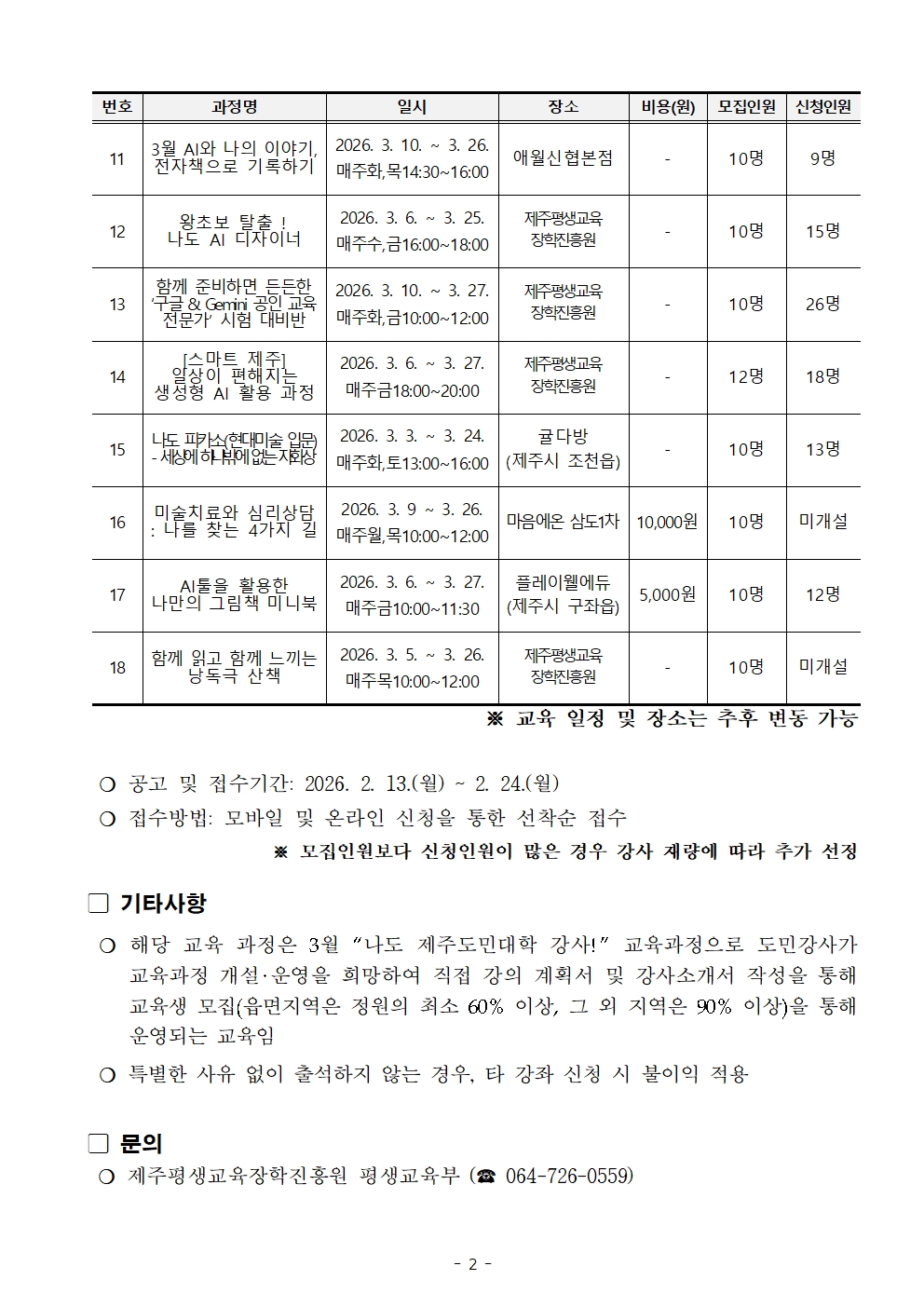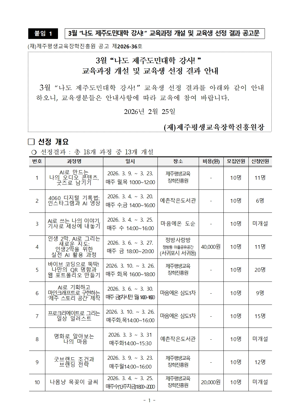 (붙임) 2026년 「제주도민대학」 3월 나도 제주도민대학 강사 교육 과정 개설 및 교육생 선정 결과 공고.pdf (276 KBytes)