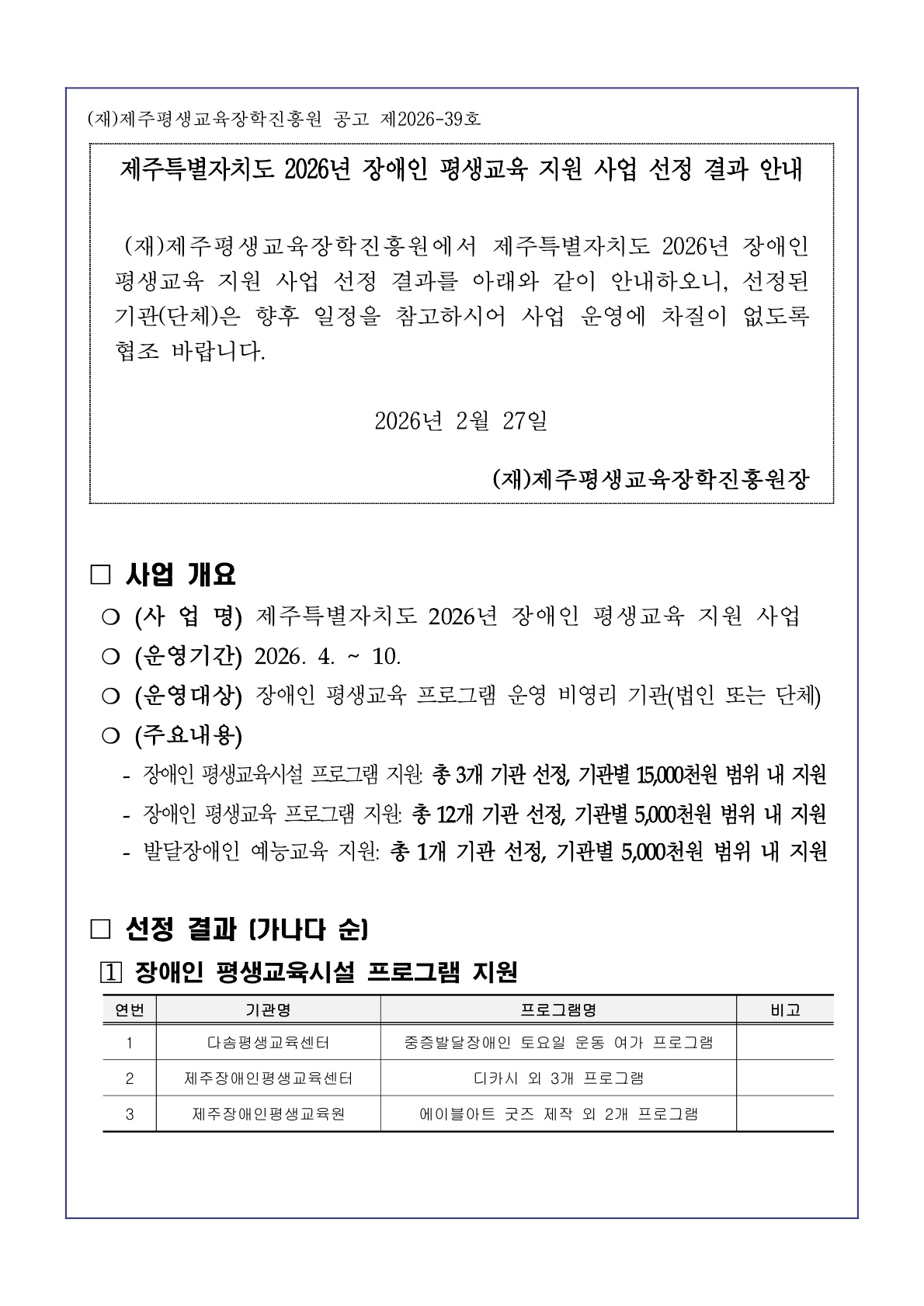 | 제 목 | 제주특별자치도 2026년 장애인 평생교육 지원 사업 선정 결과 안내 | ||