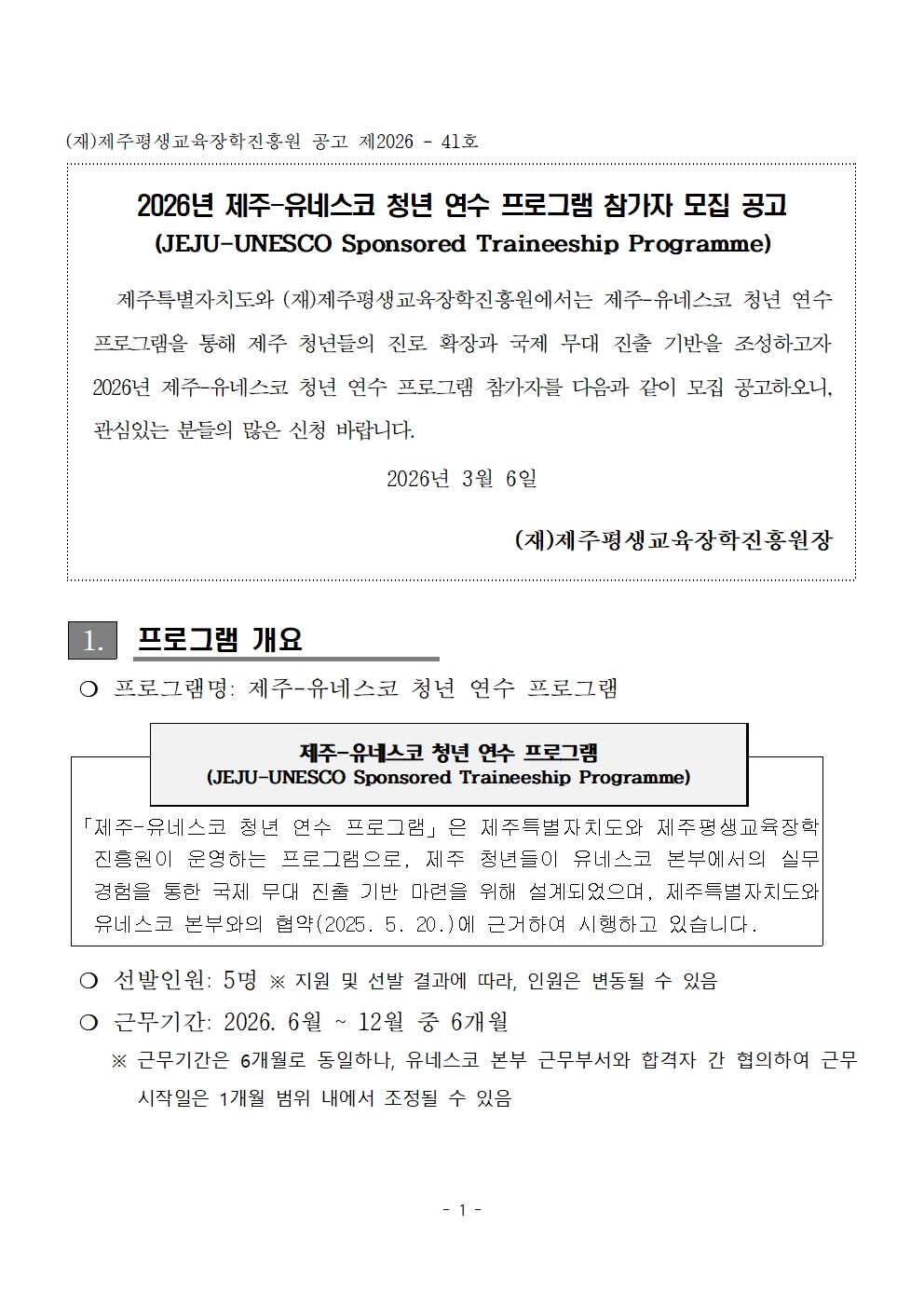 | 제 목 | 2026년 제주-유네스코 청년 연수 프로그램 연수생 모집 공고 | ||