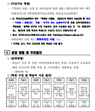 * 전화 외국어 학습비 지원은 제주평생교육장학흥원에서 지정한 교육기관에서 진행됩니다. * 선착순 모집이며, 선발자는 문자 개별 안내 예정입니다. ※ 수신거부 및 스팸처리 등으로 문자를 확인하지 못하여 발생하는 불이익에 대해서는 책임지지 않습니다. 선착순에 들었으나 문자 수신을 받지 못했을 경우(선발자 안내 이후), 미래인재육성부로 연락주시기 바랍니다. (신청하기) : 제주평생교육다모아 (damoa.jeju.kr) → 4월 8일(수)부터 신청