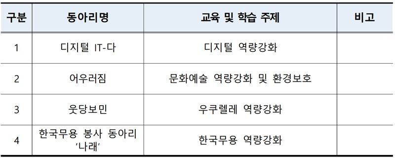 | 담당부서 | 평생교육부(장년층생애재설계지원사업) | |||