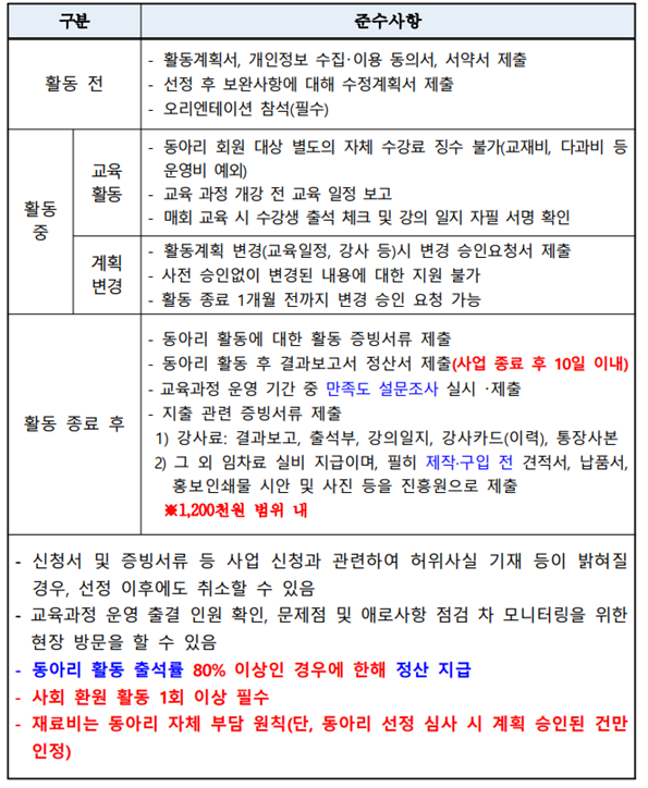 ❍ 지원범위 ❍ 준수사항 ![]() □ 기타사항 ❍ 제출된 서류에 허위사실을 기재했을 경우 선정대상에서 제외함 ❍ 선정 동아리 중 신청 포기 및 중도탈락 시 심사점수에 따라 차순위 대상에 지원 결정 ❍ 오리엔테이션, 성과발표회 등 추후 일정에 동아리 회원 모두 적극 참여 가능해야 함 ❍ 사업을 성실히 이행하지 않거나 부정수급 적발 시 지원금이 환수 조치 될 수 있음
