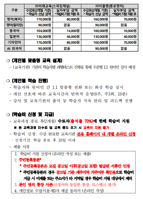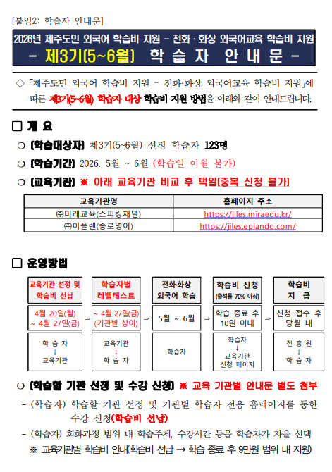 | 제 목 | 2026년 제주도민 외국어 학습비 지원 - 전화 화상 외국어교육 학습비 지원 제3기(5~6월) 학습자 선정 결과 안내 | ||