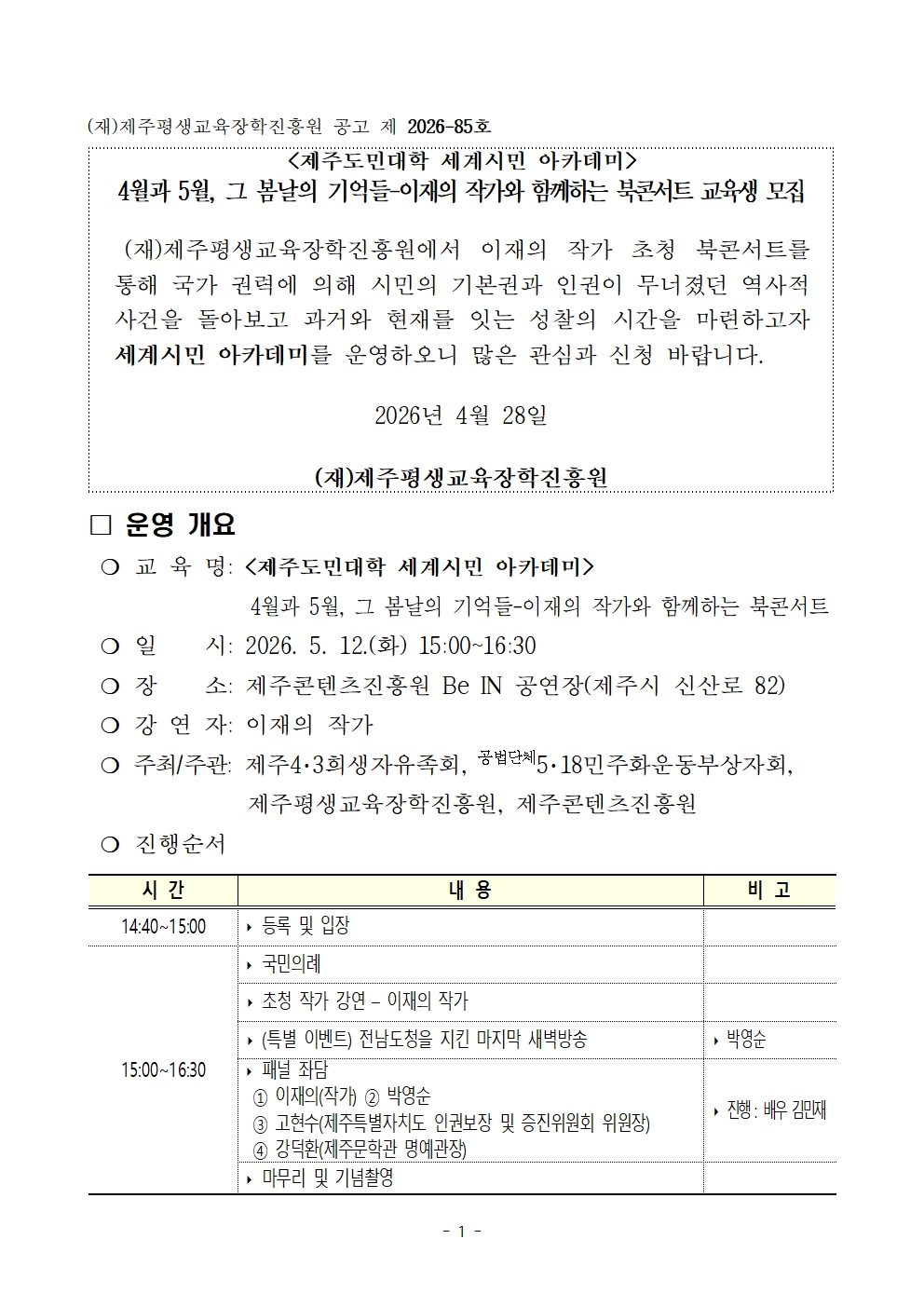| 제 목 | 제주도민대학 세계시민 아카데미 [4월과 5월, 그 봄날의 기억들-이재의 작가와 함께하는 북콘서트] 교육생 모집 | ||