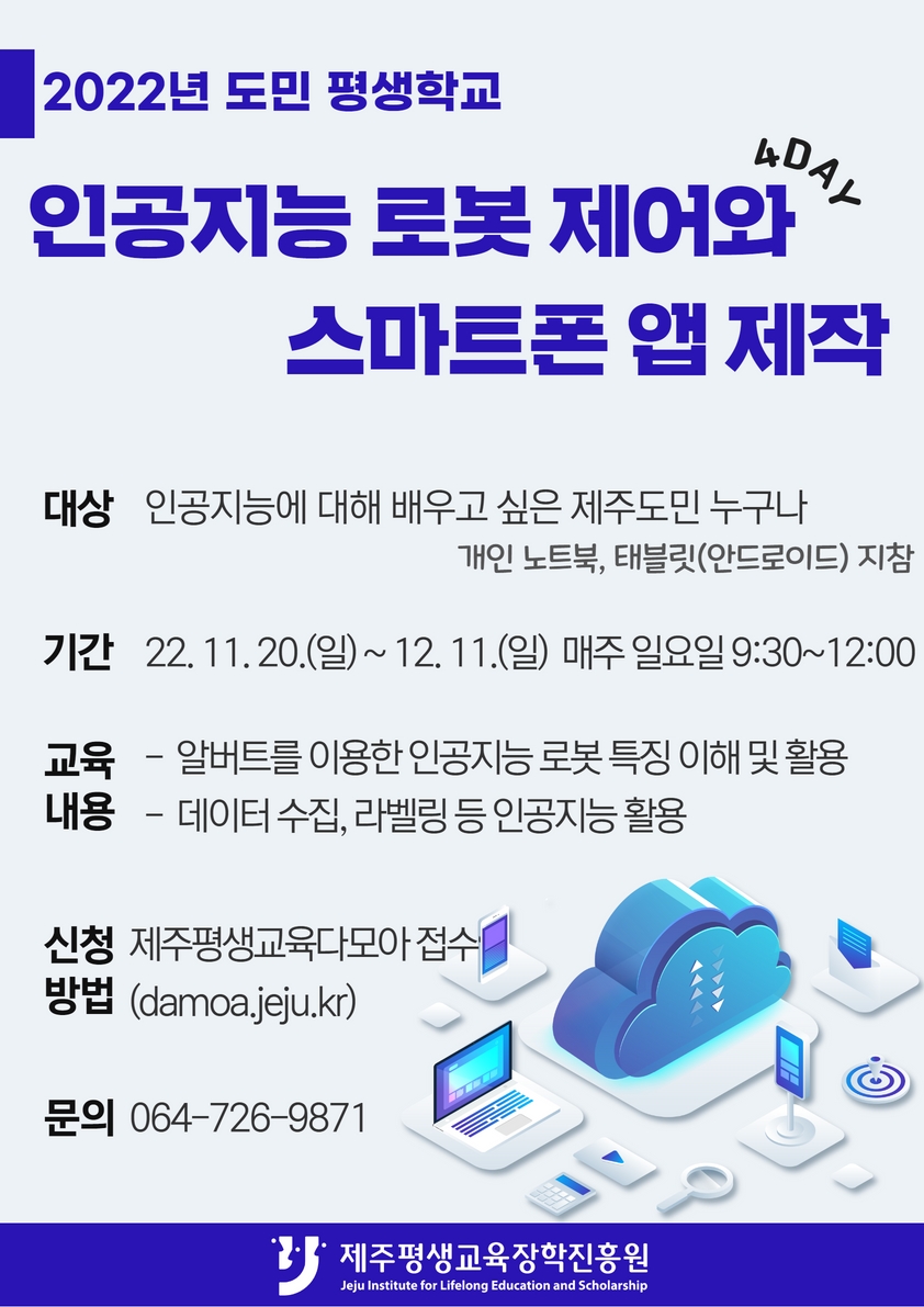 2022년 도민 평생학교 「인공지능 로봇 제어와 스마트폰 앱 제작」교육생 모집 안내
