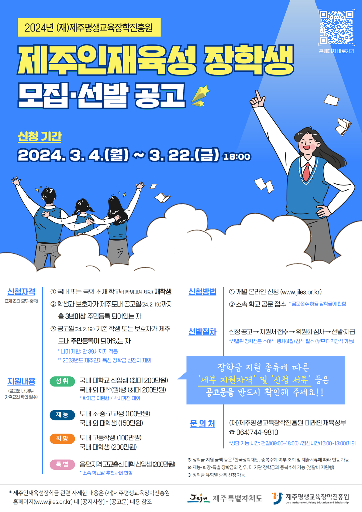 ★ 세부 지원자격 및 기타 내용은 공고문을 확인하여 주시기 바랍니다. ★ 문의) (재)제주평생교육장학진흥원 인재육성부 064)744-9810