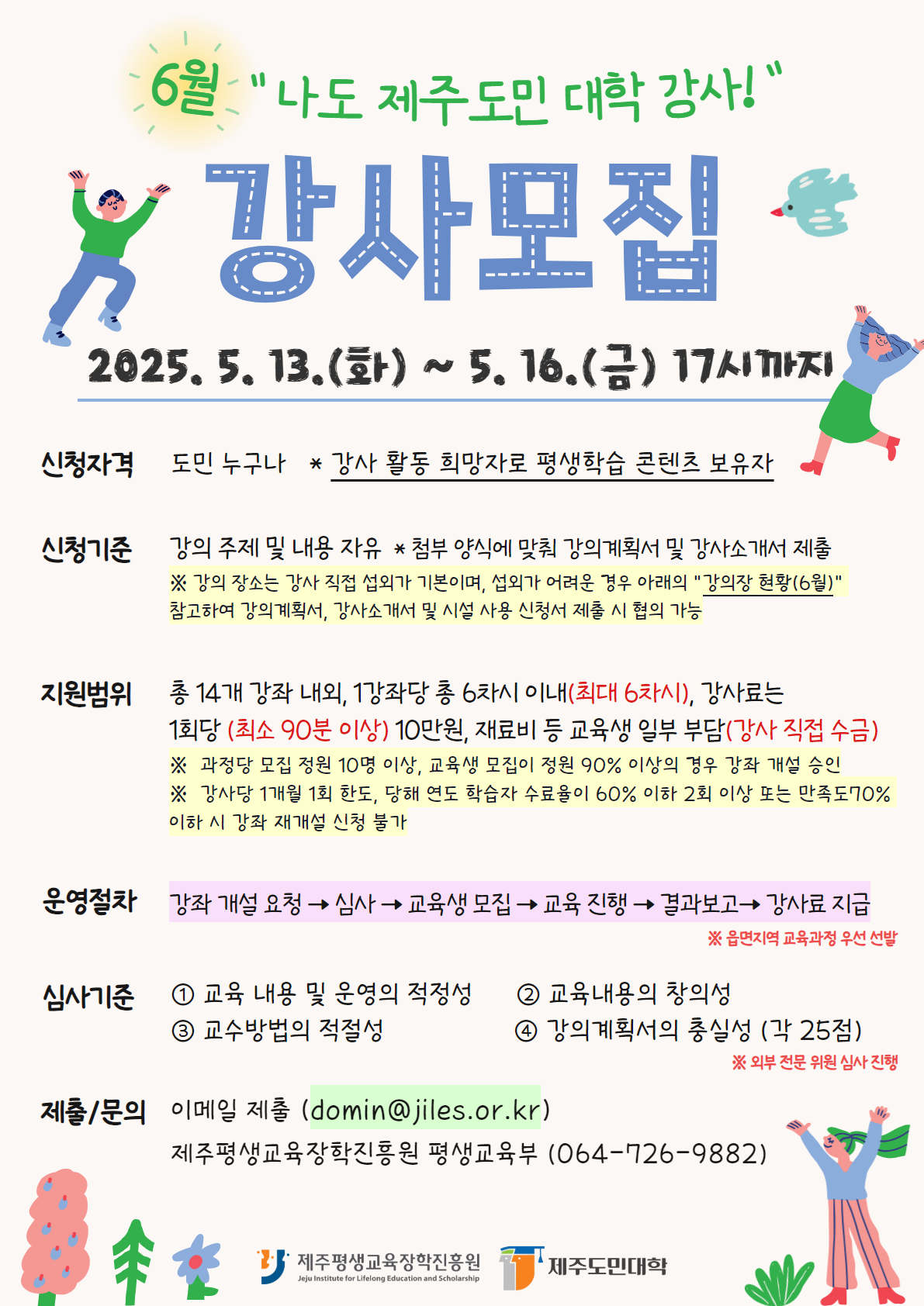 제주도민대학에서 6월 「나도 제주도민대학 강사!」 교육과정 도민 강사를 모집합니다. 관심있으신 분들의 많은 참여 바랍니다.