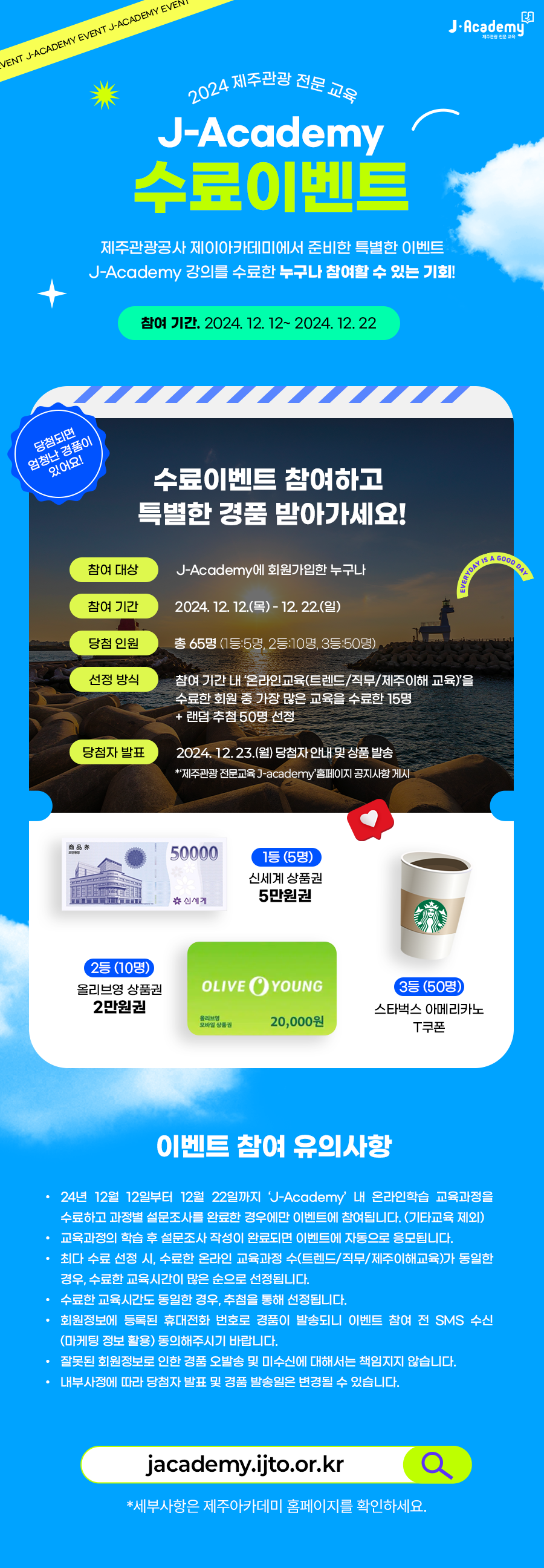 이벤트 2. J-Academy 교육 만족도 조사 이벤트 참여대상 : J-Academy에 회원가입한 누구나 참여기간 : 2024. 12. 12(목) ~ 12. 22.(일) 참여방법 : 제주관광 전문교육 J-Academy` 회원가입 또는 로그인 후 교육만족도 조사 이벤트 실시 당첨인원 : 50명(자세한 내용 붙임 참조)
