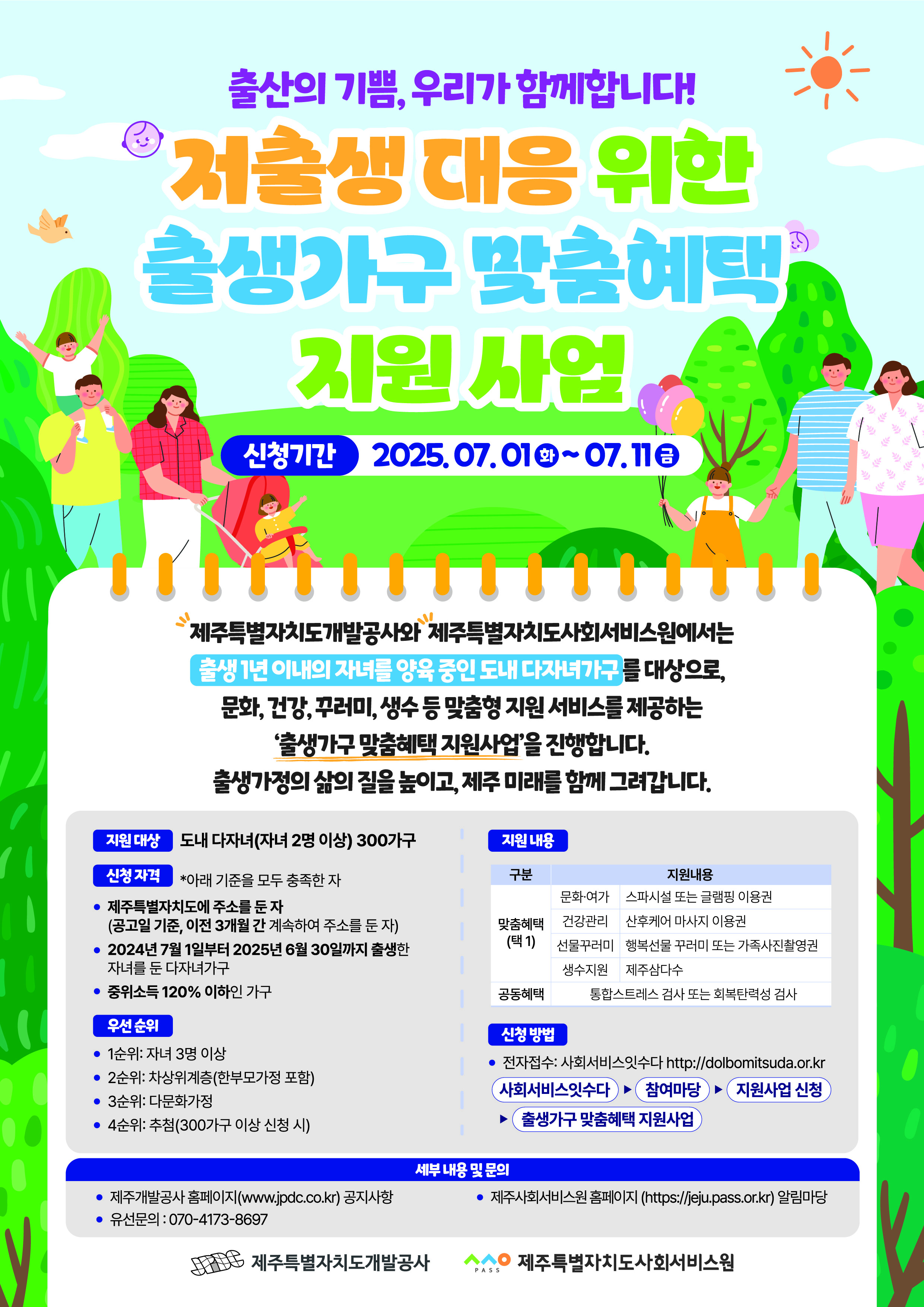 | 제 목 | [(재)제주특별자치도사회서비스원] 저출생 대응을 위한 출생가구 맞춤혜택 지원사업 안내 | ||
