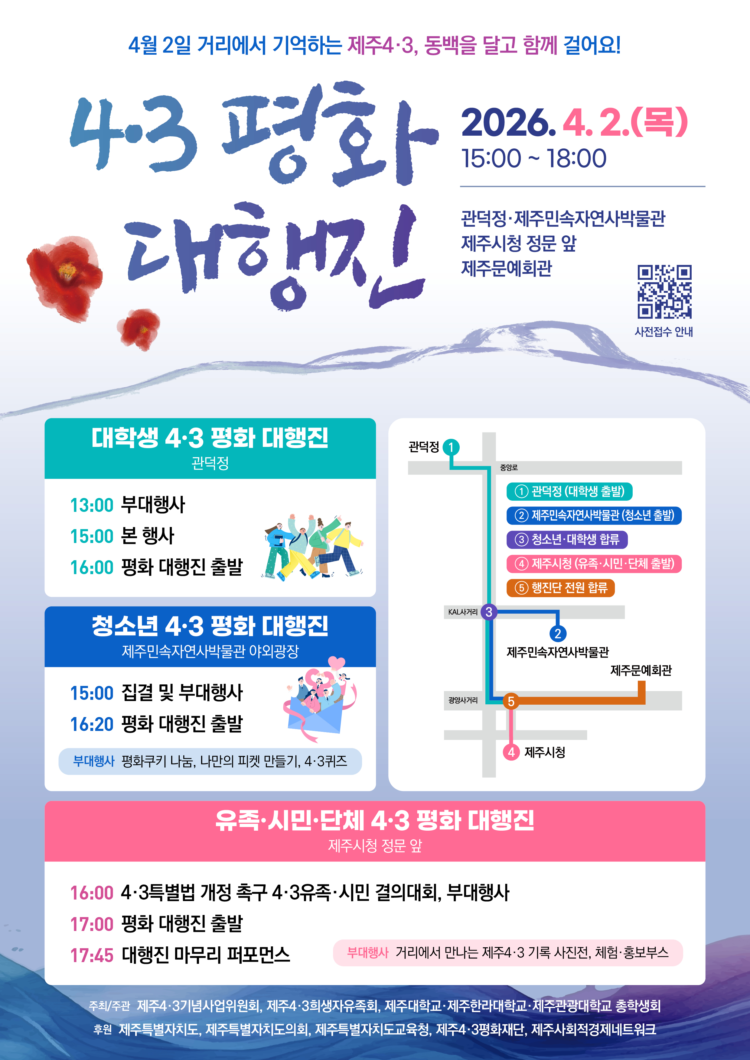제78주년 4·3희생자 추념식 봉행에 따라 전 국민이 함께 4·3의 역사적 의미를 되새기고 평화와 인권의 가치를 나누기 위해 4·3추념식 전일 행사인 4월 2일 4·3 평화 대행진이 개최되며 해당 행사의 사전 접수를 붙임과 같이 안내드립니다. |