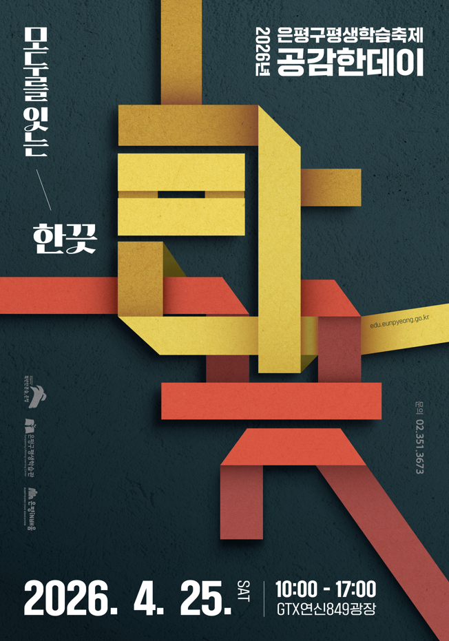 2026년 공감한데이 은평평생학습축제를 붙임과 같이 안내드립니다. □ 행사개요 ○ 행 사 명: 2026년 공감한데이 은평평생학습축제 - 슬 로 건: "모두를 잇는 한끗" ○ 일 시: 2026. 4. 25.(토) 10:00~17:00 ○ 장 소: GTX연신849광장 ○ 주최/주관: 은평구평생학습관 ○ 주요내용: 학습공연한마당, 학습체험한마당 운영 ○ 문 의: 은평구평생학습관(☎***-***-****) |
