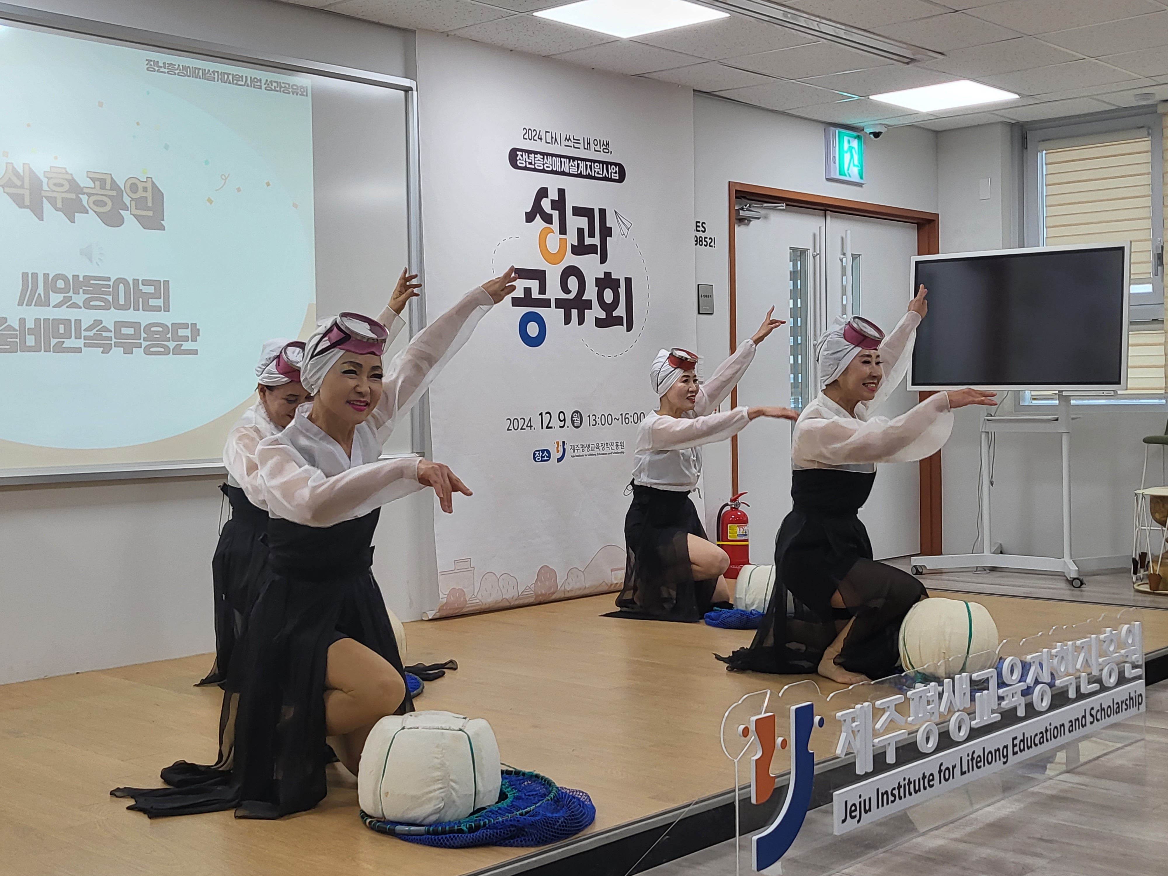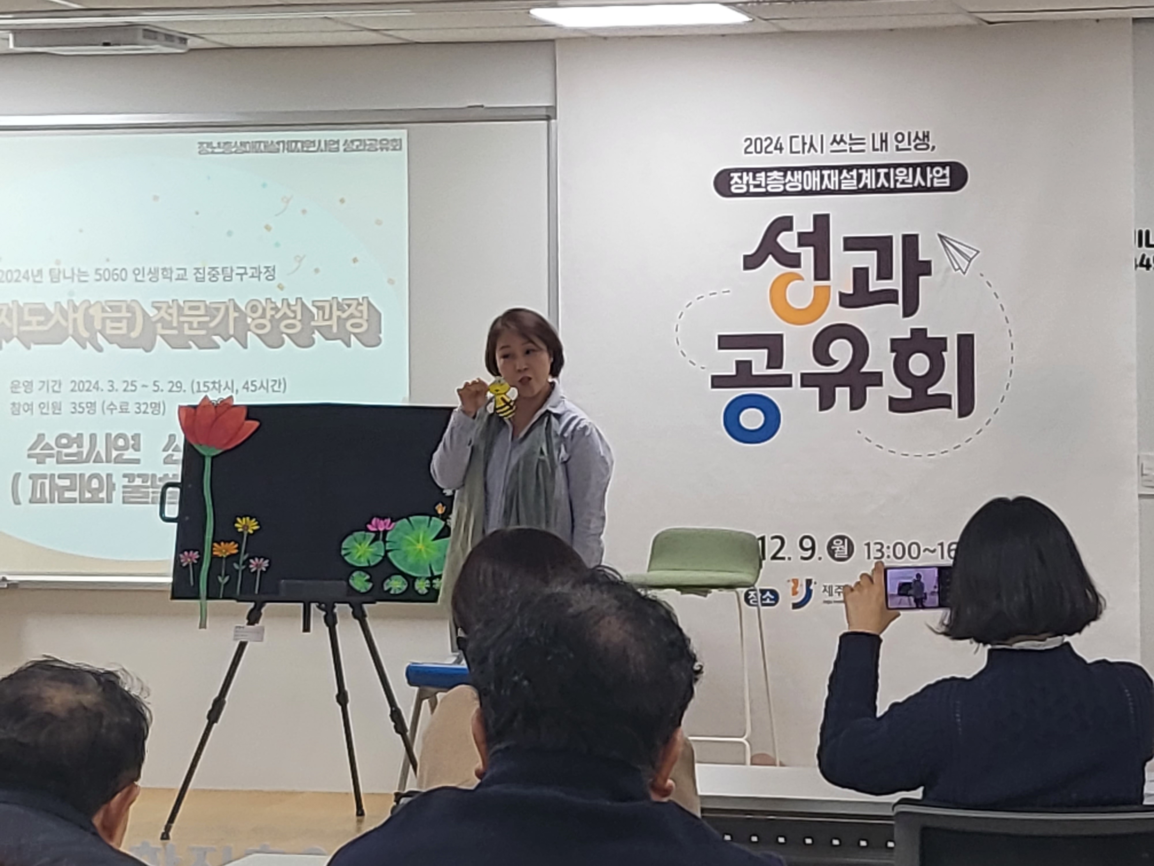 - 일시: 2024. 12. 9. 13:00~16:00 - 장소: 제주평생교육장학진흥원 - 대상: 2024년도 장년층생애재설계지원사업 참여자 및 관계자 80명 - 내용: 2024년도 탐나는 5060 인생학교 및 재능나눔활동지원사업 참여 결과 공유