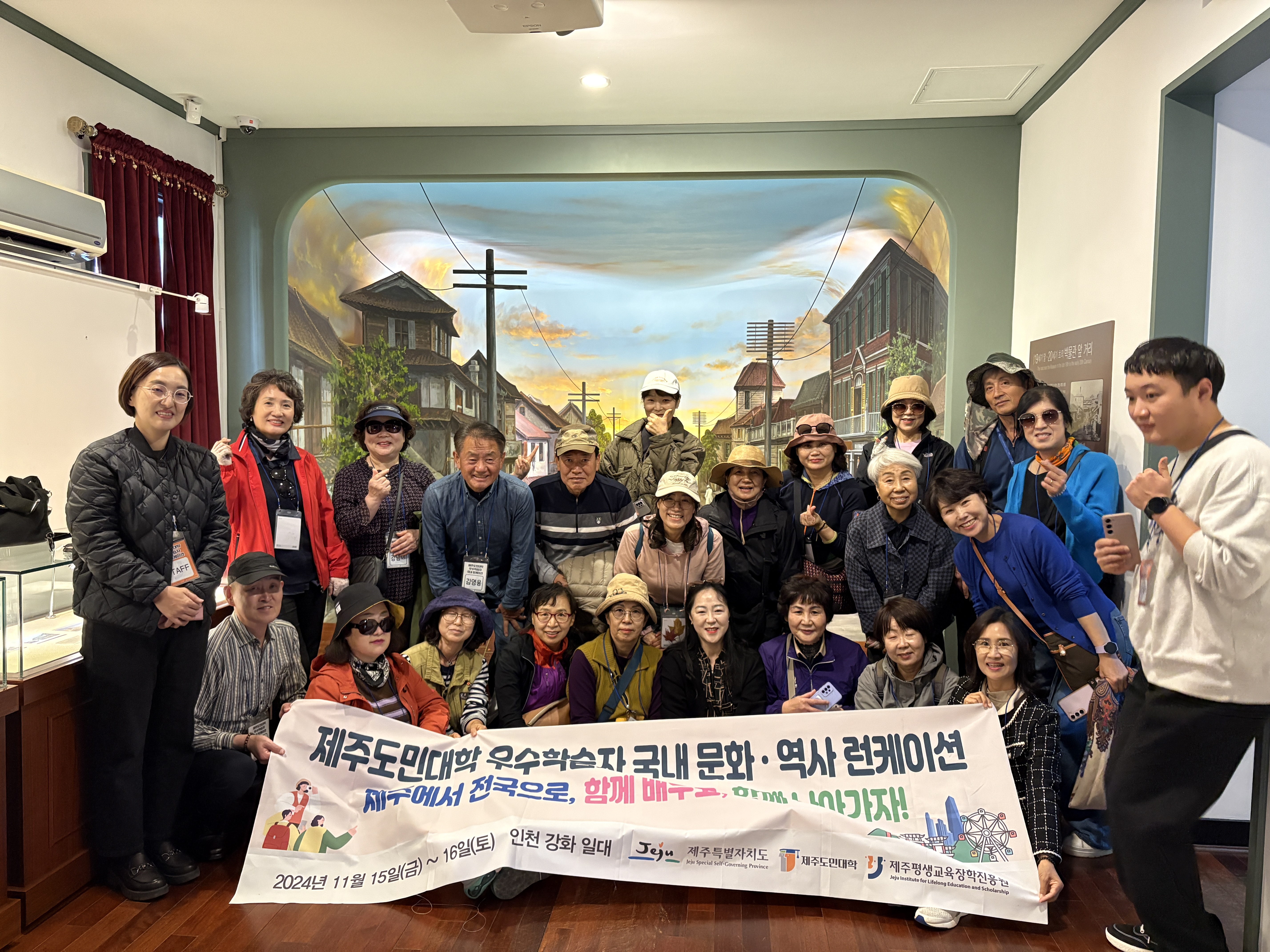 【2024 제주도민대학 우수학습자 국내 문화·역사 런케이션 운영】 - 일시: 2024. 11. 15.(금) ~ 11. 16.(토) (1박 2일) - 장소: 인천·강화 일대 및 공주·부여·익산 일대 - 참여자: 제주도민대학 우수학습자 57명 대상 - 내용: 인천·강화(근대문화), 공주·부여·익산(백제문화) 문화 및 역사 현장 탐방 연수 등 |