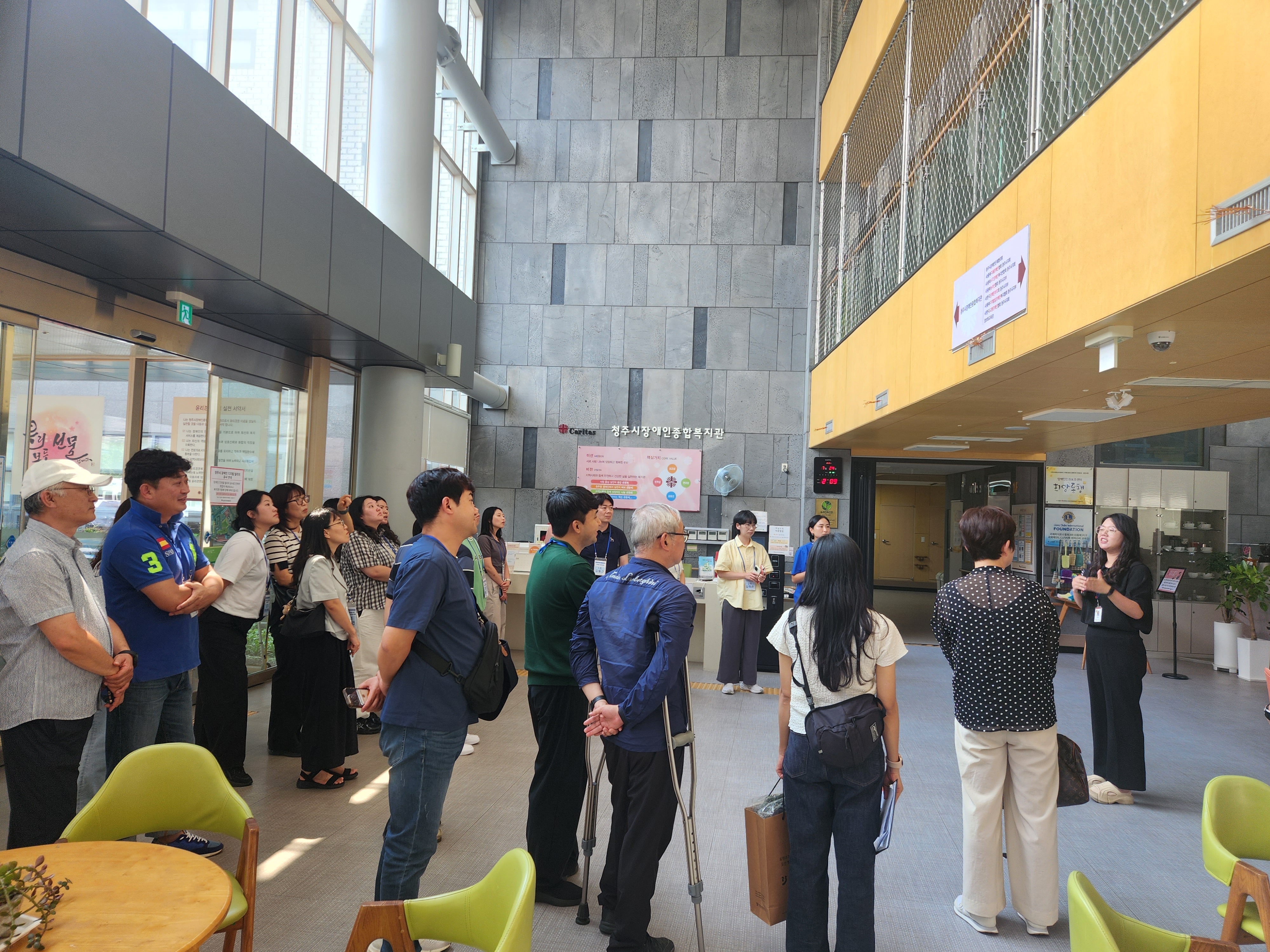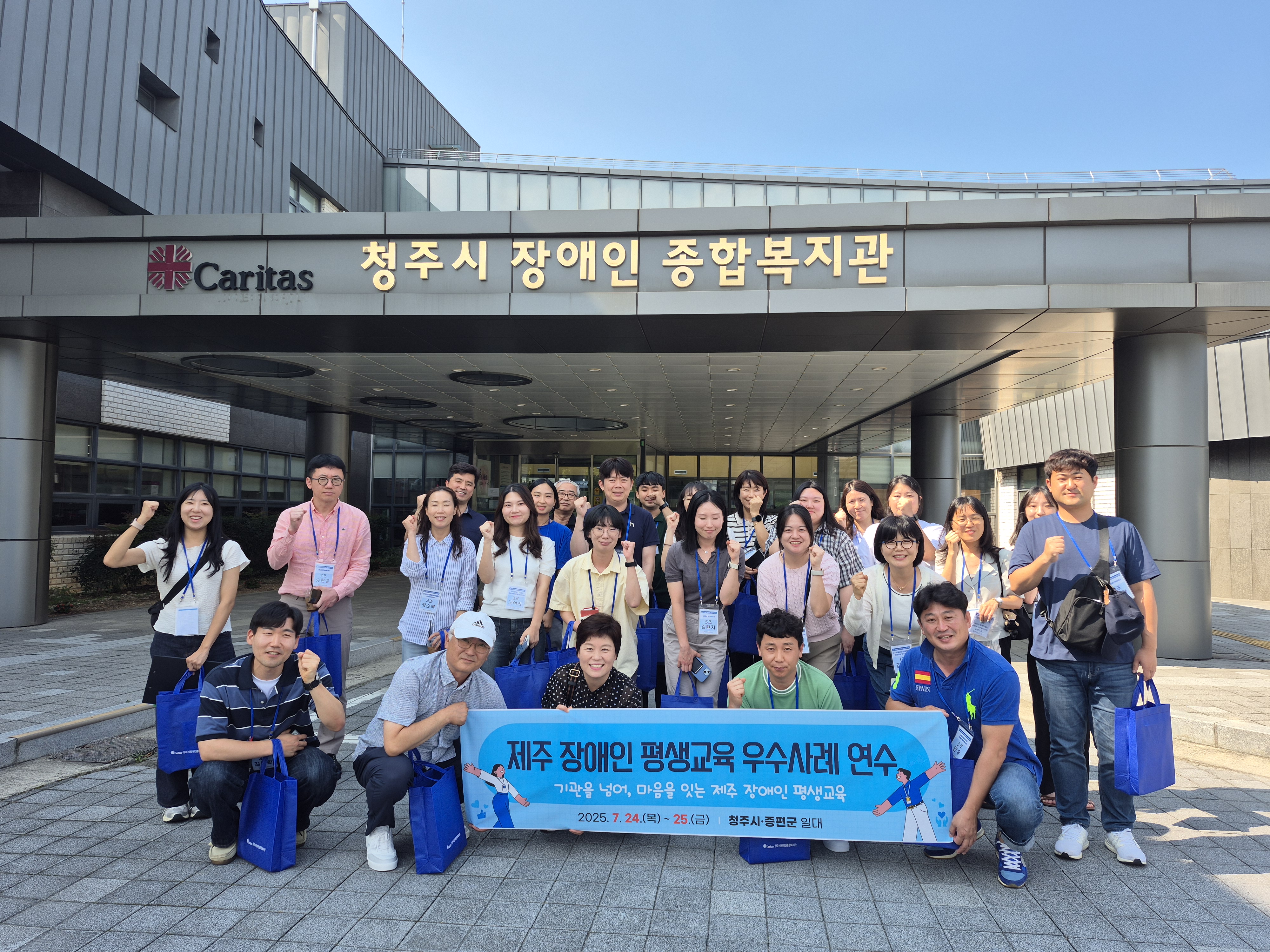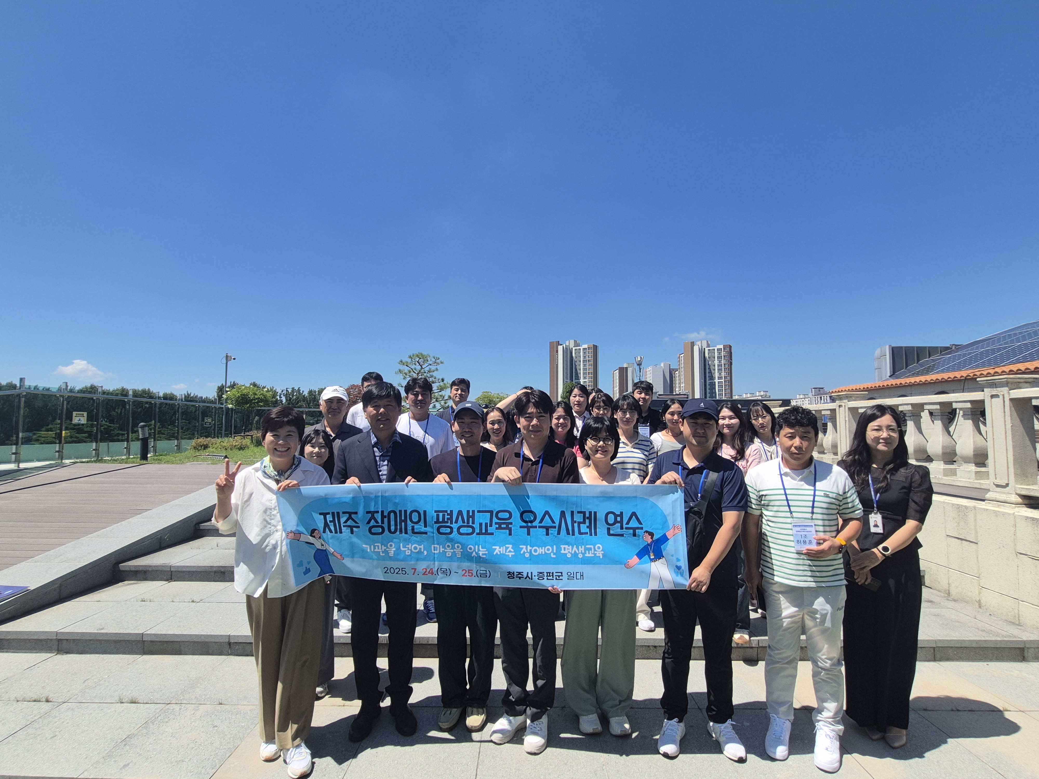 <2025년 제주 장애인 평생교육 우수사례 연수> ◎ 일시: 2025. 7. 24.(목) ~ 25.(금) ◎ 장소: 충청북도 청주시, 증평군 일대 ◎ 참가자: 제주 장애인 평생교육 종사자 및 관계자 26명 ◎ 내용: 우수 장애인 평생학습도시 방문 및 특강 등