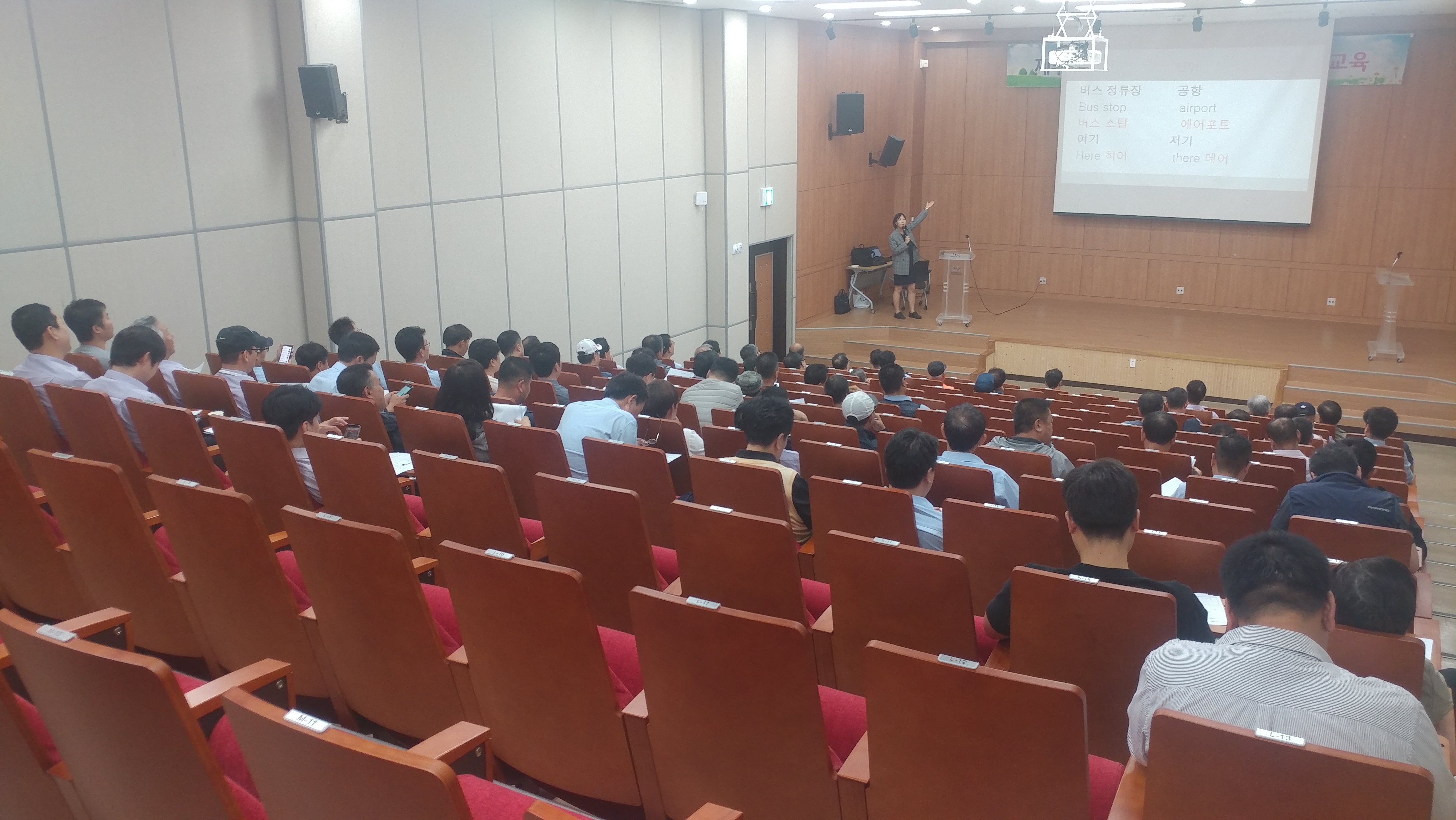 <제주시공영버스 영어 특별강좌 오후반> 모습 2 - 일 시 : 2019. 9. 23(월) 15:00 ~ 17:00 - 장 소 : 제주시 근로자종합복지관 3층 대강당 - 참여인원 : 제주시공영버스 기사 58명 - 주요내용 : 실용 영어 회화 기초