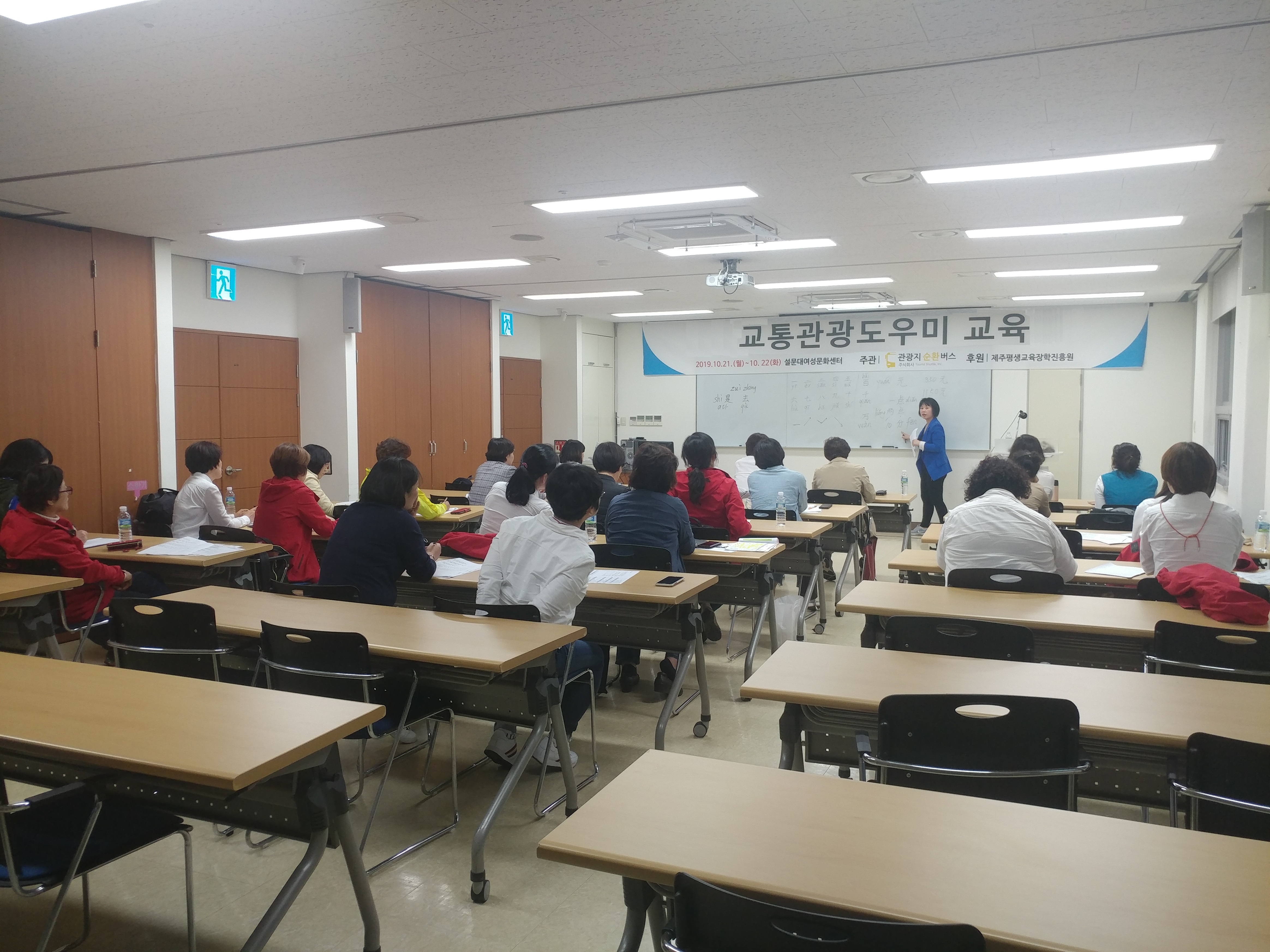 <관광지순환버스 교통관광도우미 중국어 특별강좌> 모습 2 - 일 시 : 2019. 10. 21(월) 20:00 ~ 21:00 - 장 소 : 설문대여성문화센터 다목적실 - 참여인원 : 관광지순환버스 교통관광도우미 33명 - 주요내용 : 실용 중국어 회화 기초