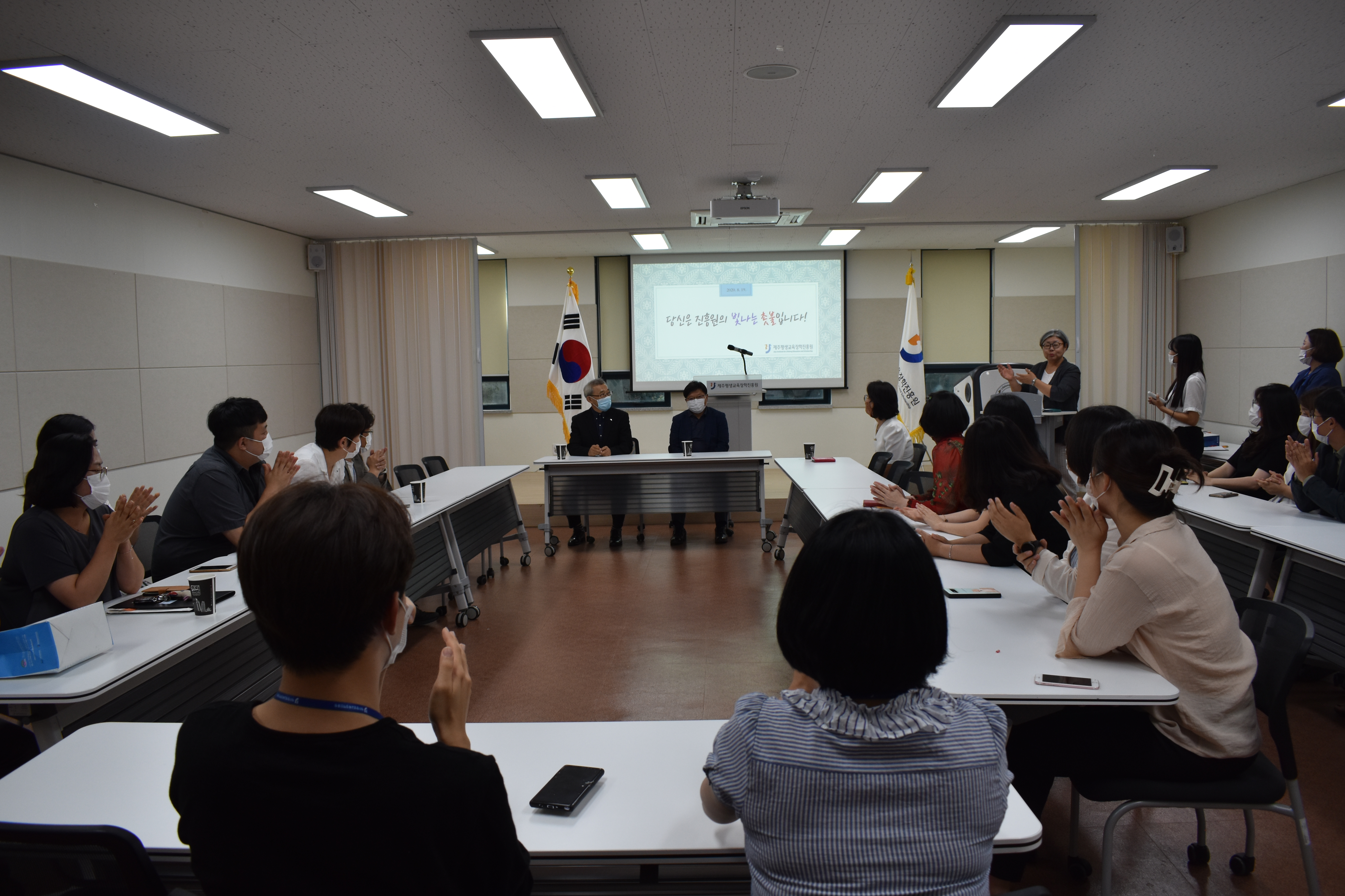 <제주평생교육장학진흥원 본부장님, 운영부장님 송별회 개최> - 일시 : 2020년 8월 19일(수) 17:30 ~ 18:00 - 장소 : 제주평생교육장학진흥원 2층 평생배움공간 - 참석 : 제주평생교육장학진흥원 임직원 30여명