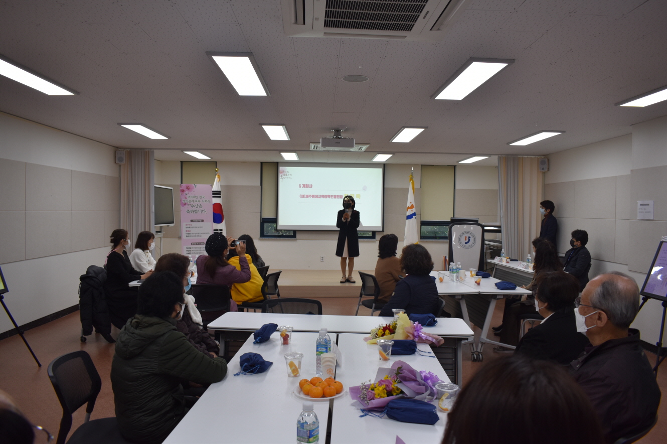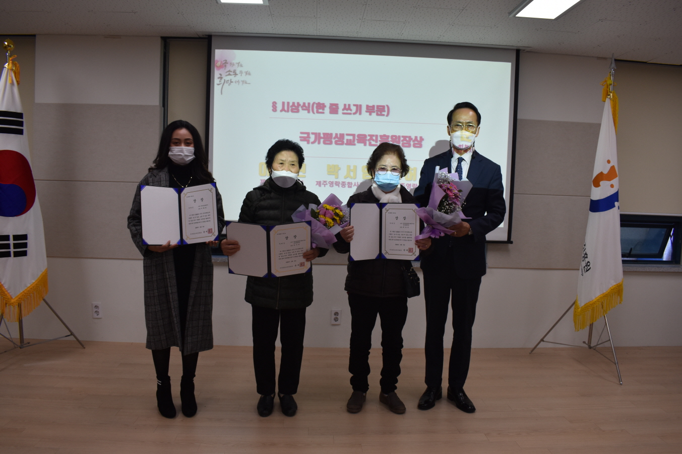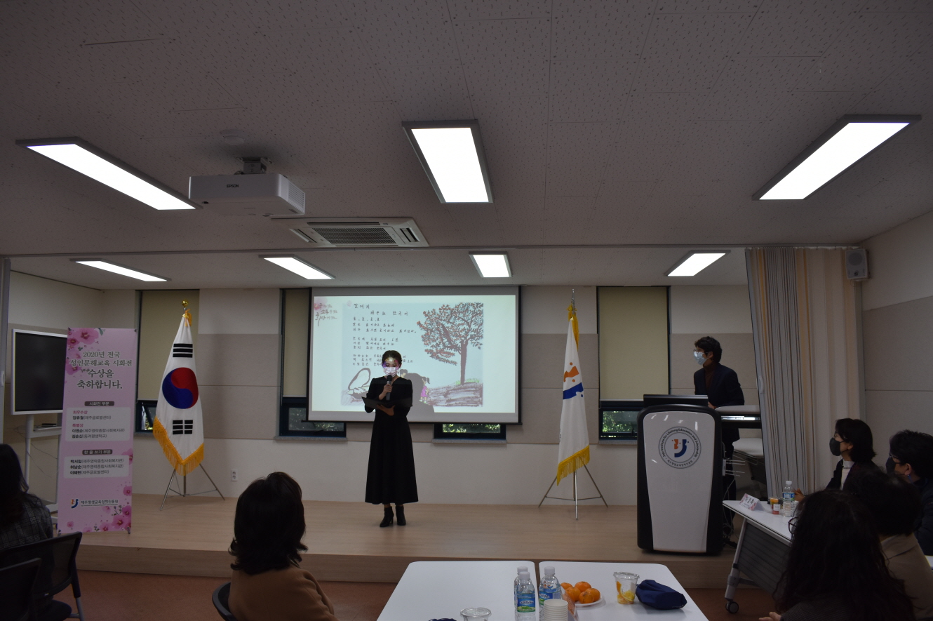 <2020년 전국 성인문해교육 시화전 수상자 시상식 개최> ❍ 일 시: 2020. 11. 24.(화) 13:20~14:20 ❍ 장 소 : 제주평생교육장학진흥원 2층 평생배움공간 ❍ 참석자 : 수상 문해교육기관 및 진흥원 관계자 20명 ❍ 진행순서 및 내용