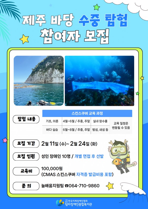 | 강좌소개 | 제주 바다 속을 탐험하는 짜릿한 순간! ○ 교육내용: 성인 장애인 스킨스쿠버 자격증 교육과정 ○ 모집 기간: 2월 11일 (수)~2월 24일 (화) 오후 5시 ○ 신청 방법: 방문 접수(복지관 1층 사무국 늘배움지원팀) ○ 선정 방법: 접수 후 개별 면접 후 선발 ○ 문의 사항: 늘배움지원팀 064-710-9860