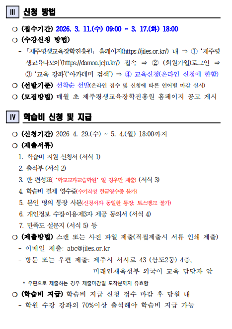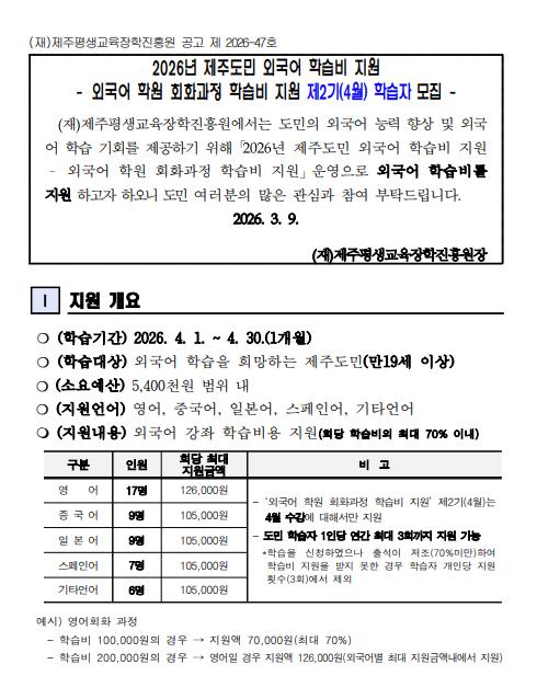 | 강좌명 | 2026년 제주도민 외국어 학습비 지원 - 외국어 학원 회화과정 제2기(4월) 학습비 지원 학습자 모집(중국어) - 접수마감 | 계좌번호 | ||||