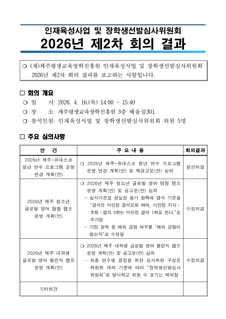 2026년 제2차 인재육성사업 및 장학생선발심사위원회 회의 결과