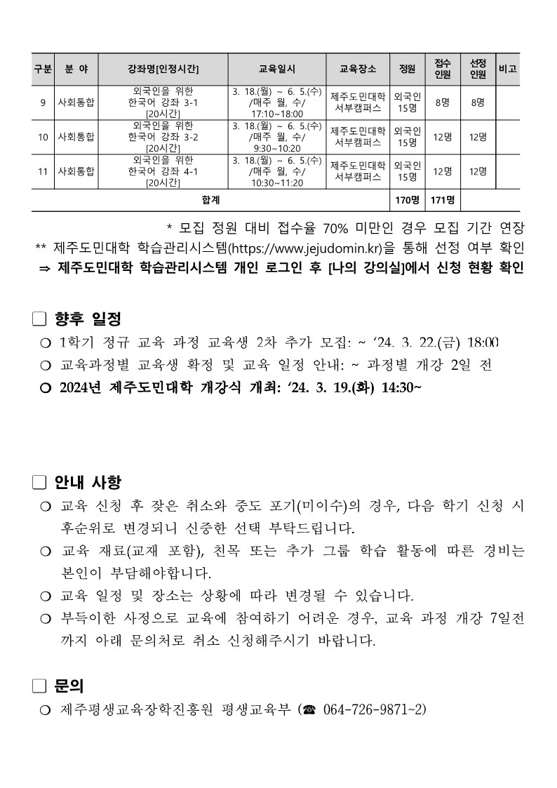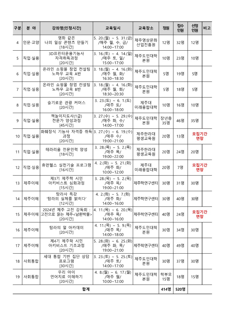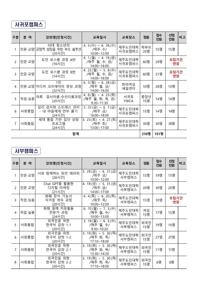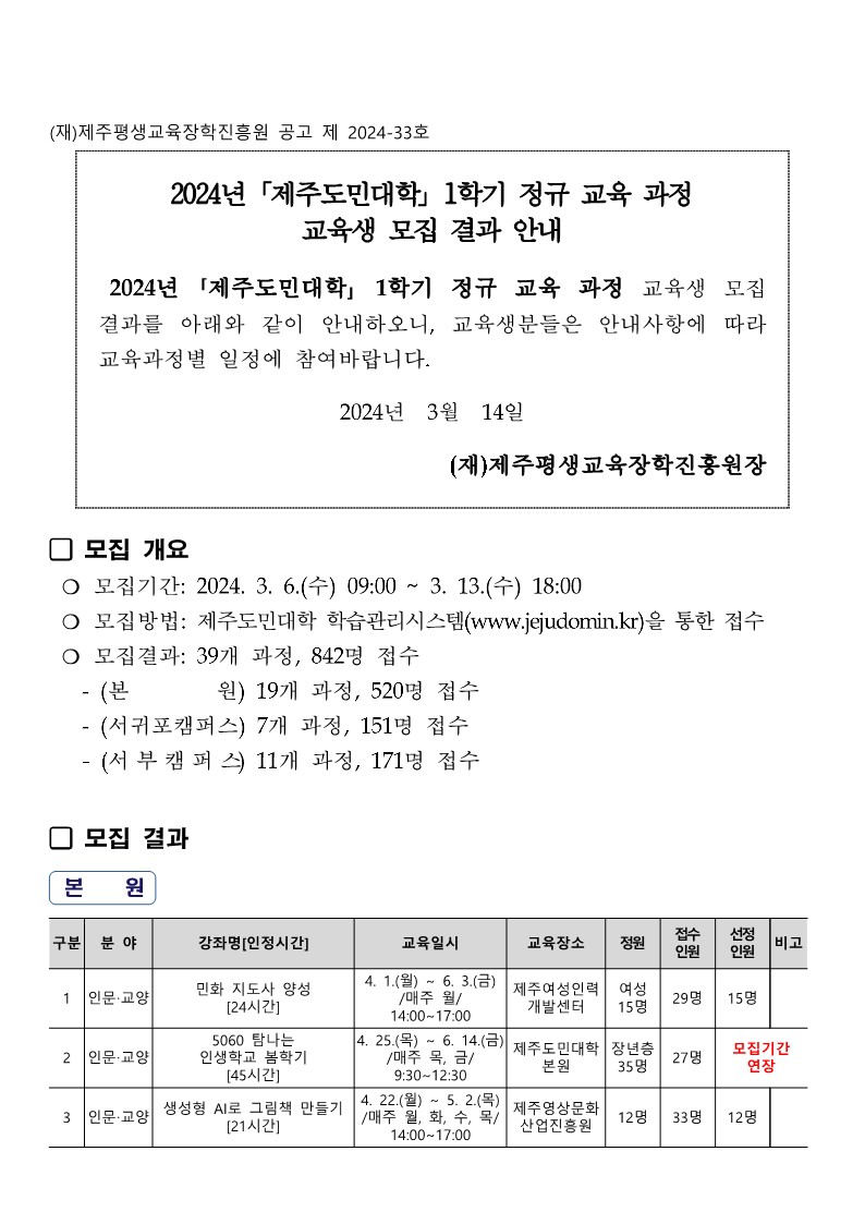 제 목 | 2024년 「제주도민대학」 1학기 정규 교육 과정 교육생 모집 결과 안내 | ||