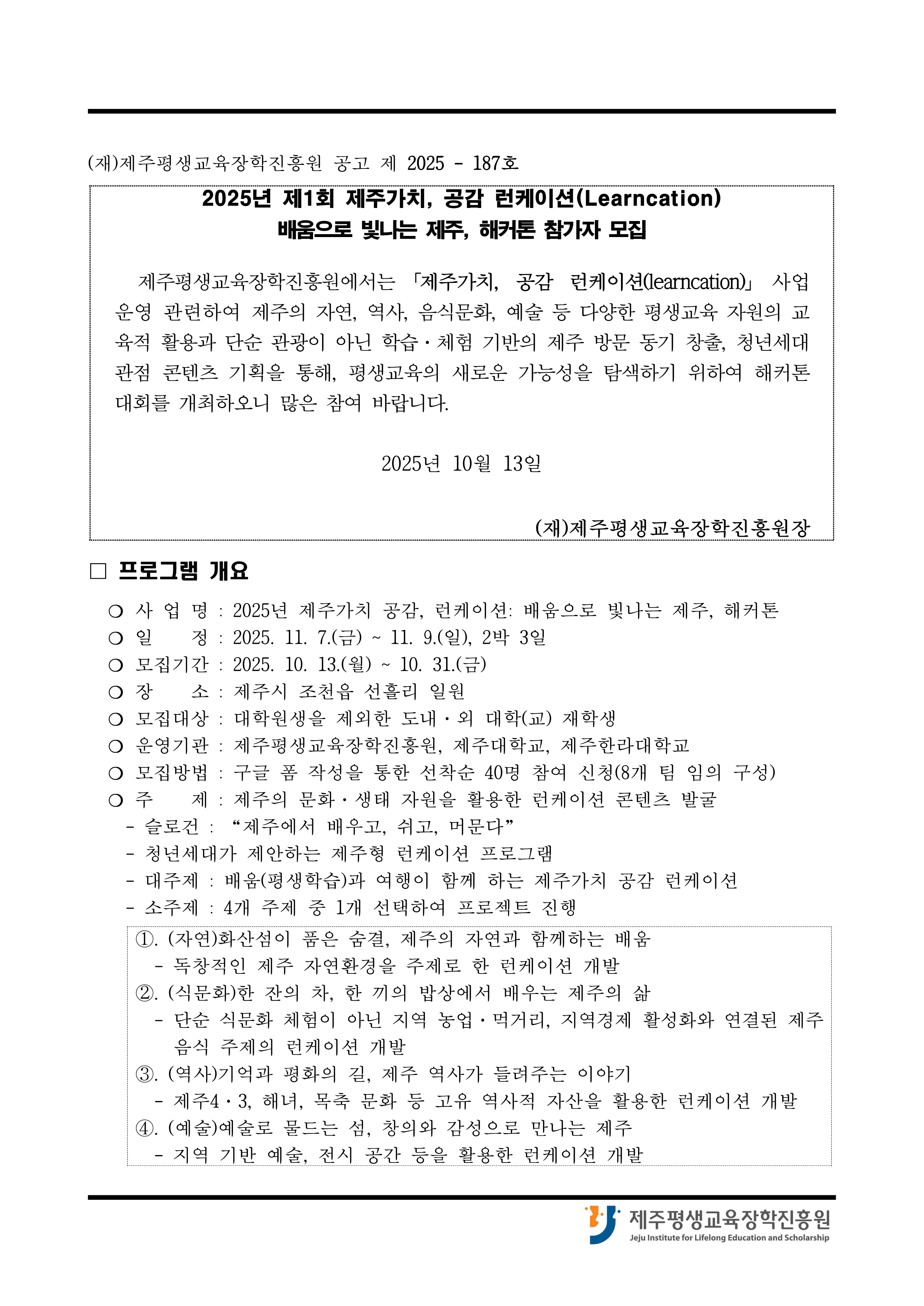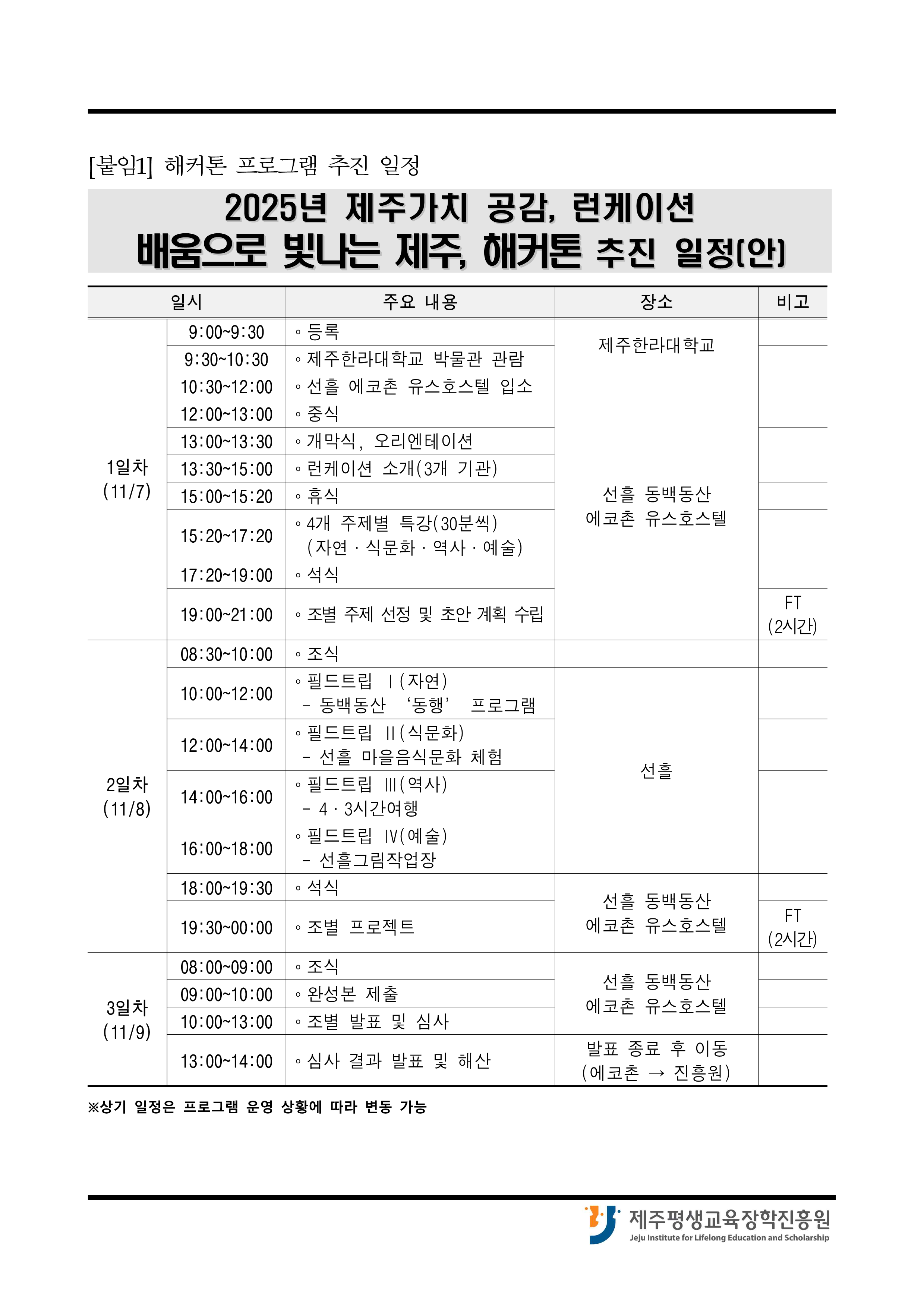 제 목 | 2025년 제1회 제주가치, 공감 런케이션(Learncation) 배움으로 빛나는 제주, 해커톤 참가자 모집 | ||
