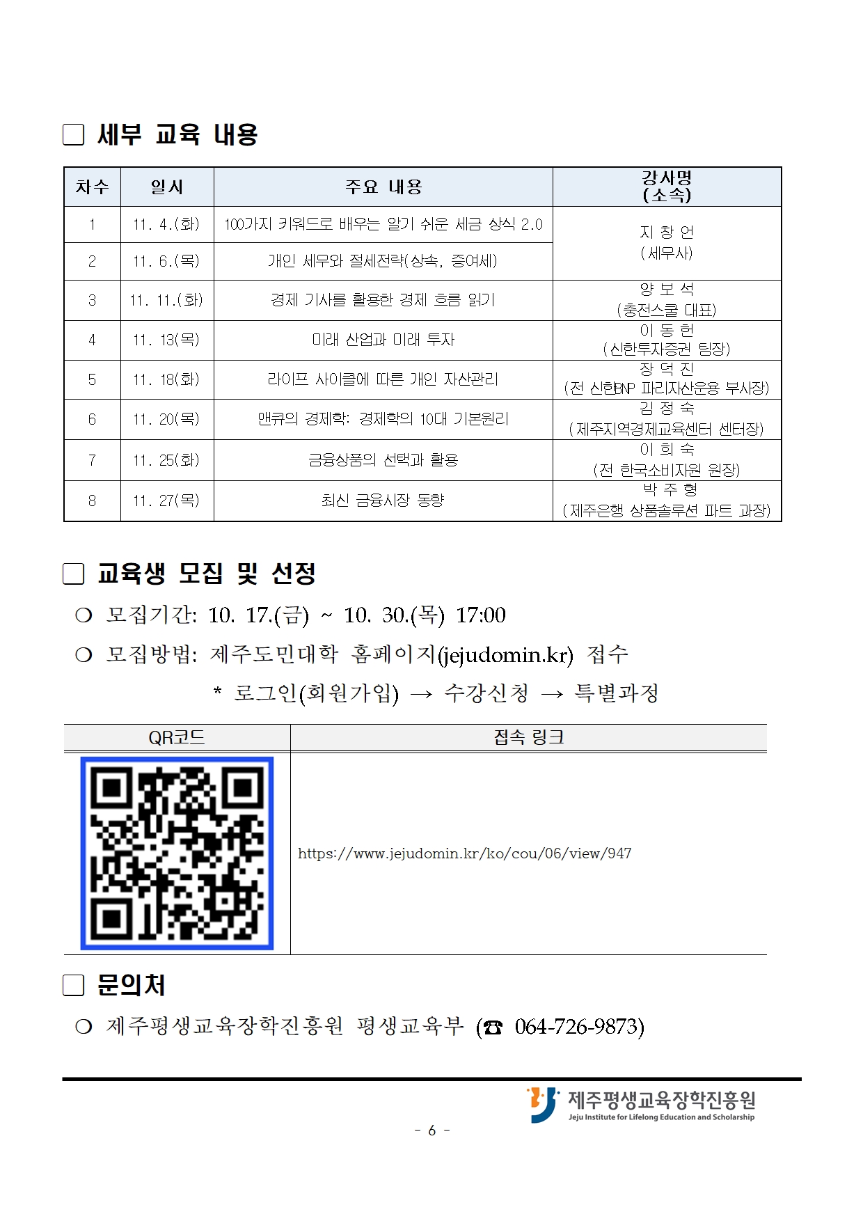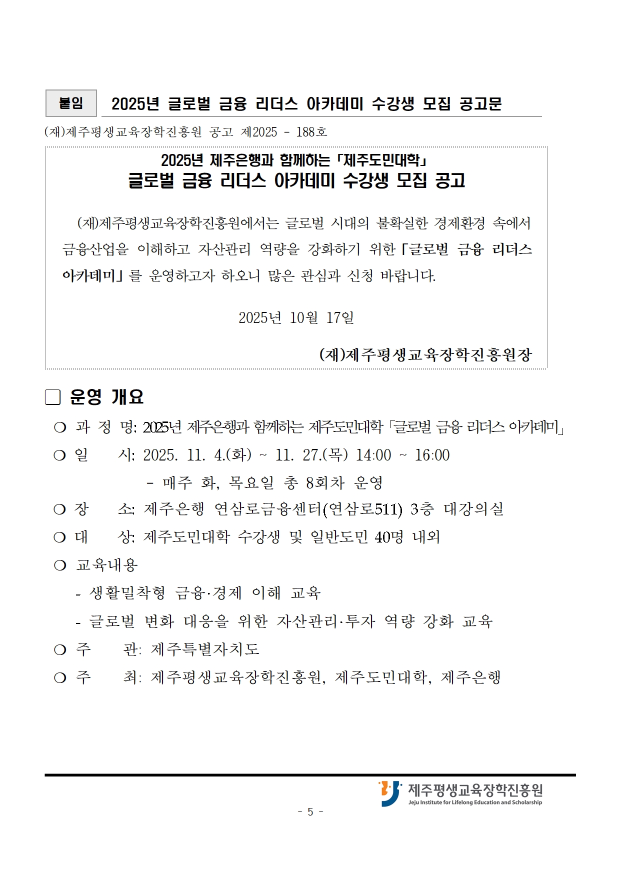 제 목 | 2025년 제주도민대학 「글로벌 금융 리더스 아카데미」수강생 모집 공고 | ||