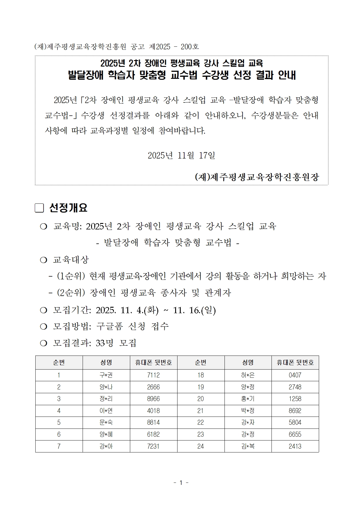 2차 장애인 평생교육 강사 스킬업 교육 -발달장애 학습자 맞춤형 교수법- 수강생 선정 결과 안내