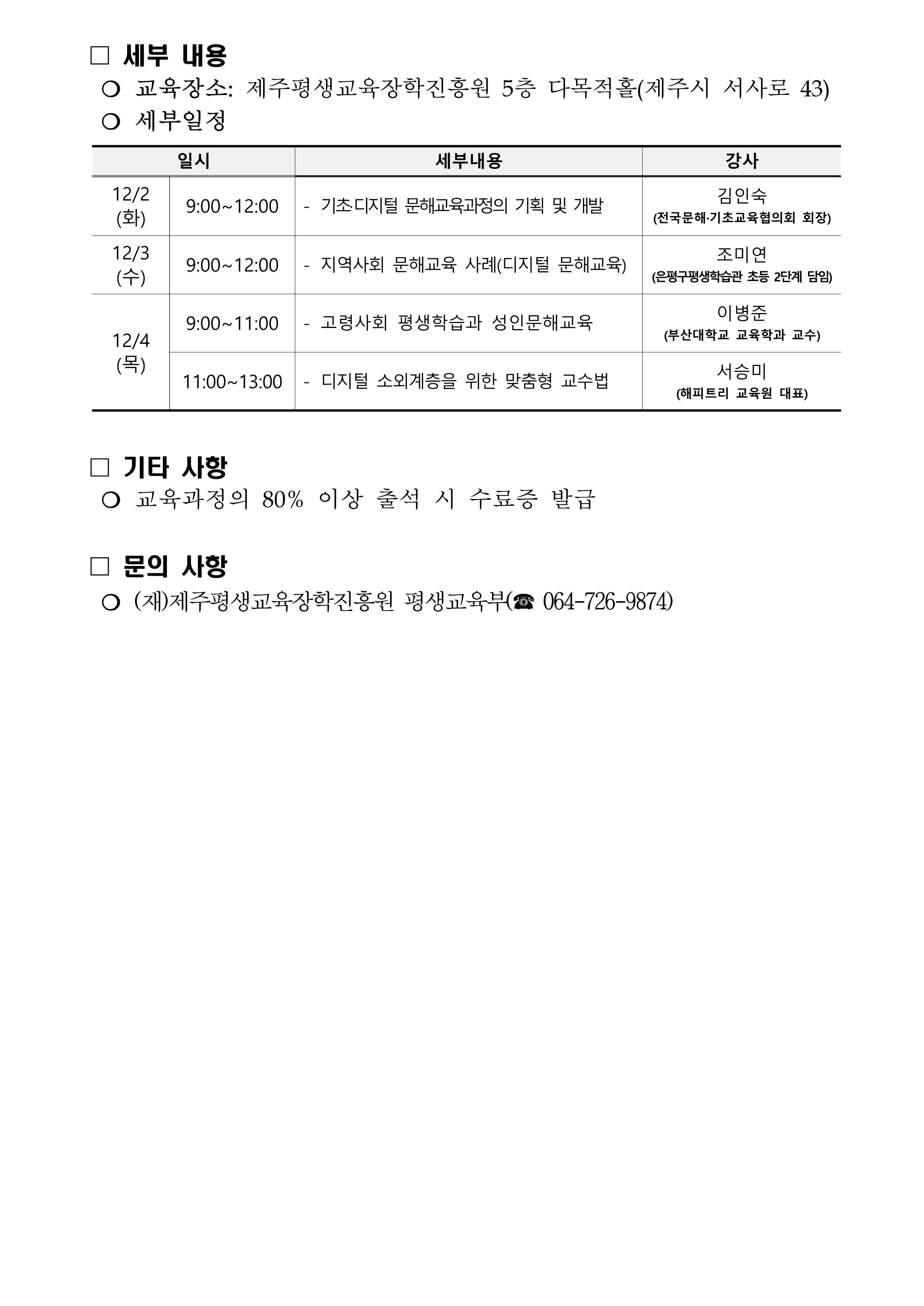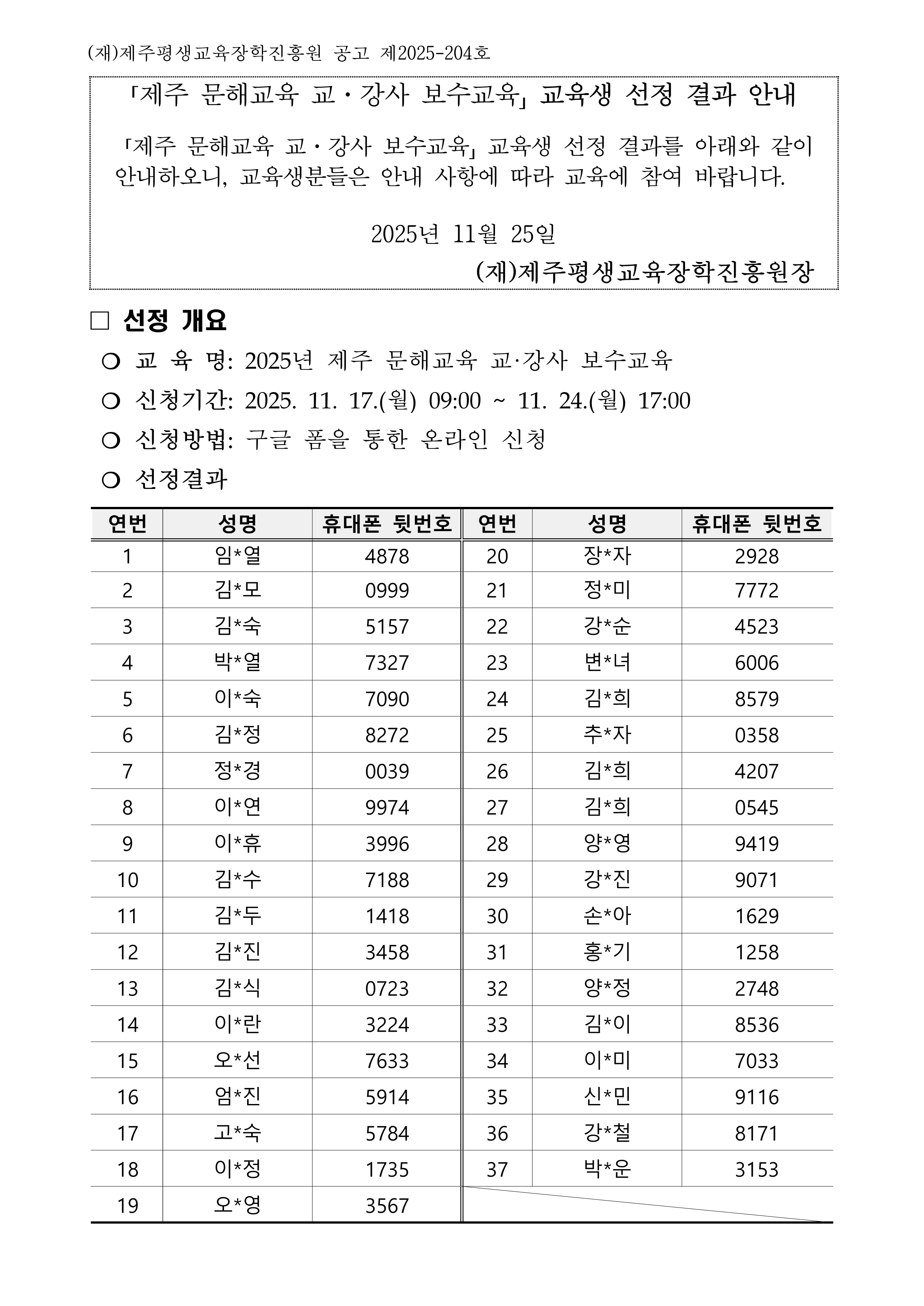 [공고문] 「제주 문해교육 교·강사 보수교육」교육생 선정 결과 안내.pdf (189 KBytes)