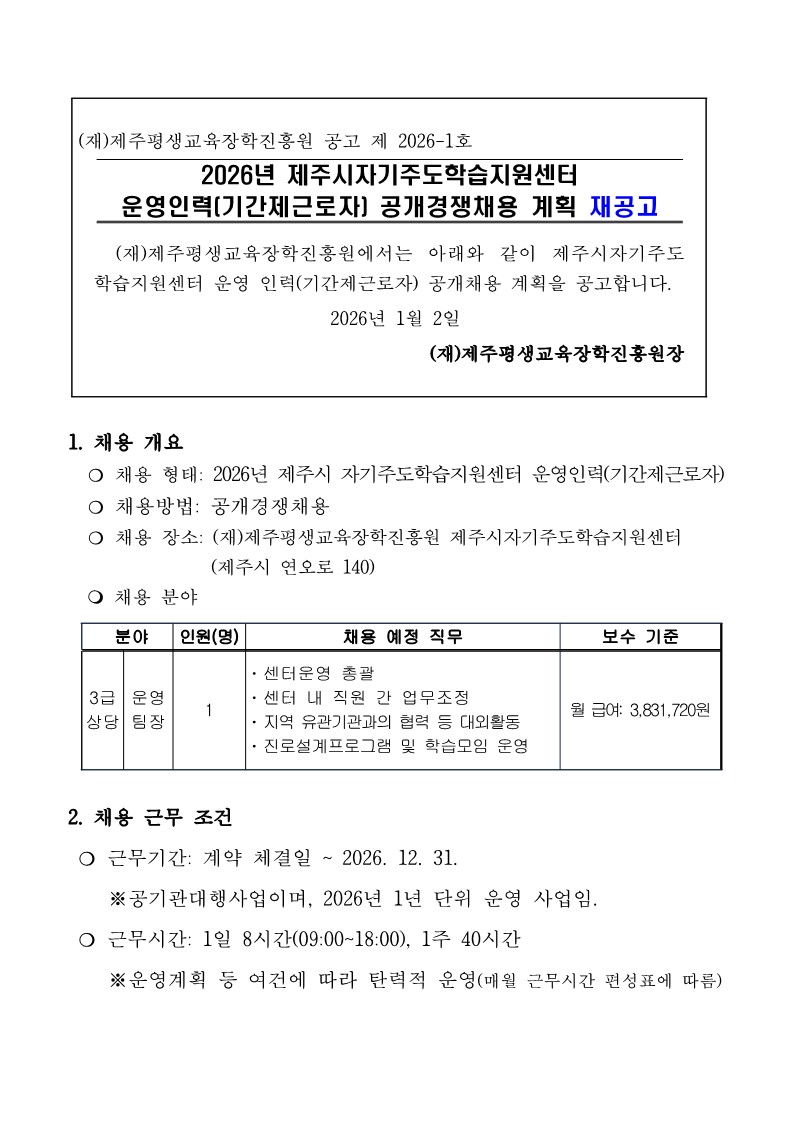 | 제 목 | 2026년 제주시자기주도학습지원센터 운영인력(기간제근로자) 공개경쟁채용 계획 재공고 | ||