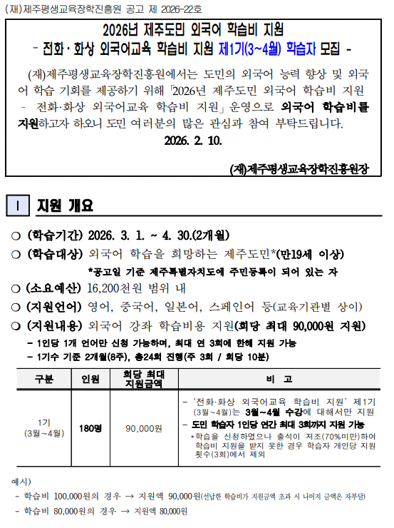 | 제 목 | 2026년 제주도민 외국어 학습비 지원 - 전화 화상 외국어교육 학습비 지원 제1기(3~4월) 학습자 모집 - | ||