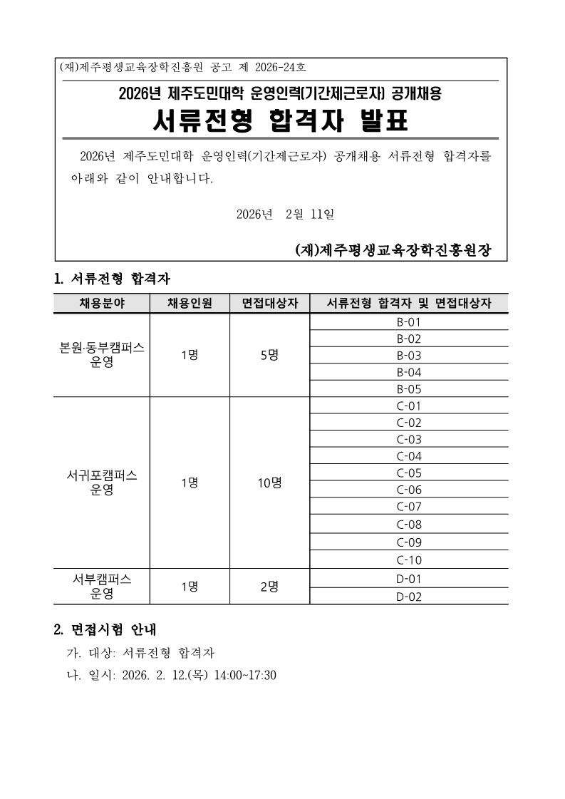| 제 목 | 2026년 제주도민대학 운영인력(기간제근로자) 공개채용 서류전형 합격자 발표 | ||