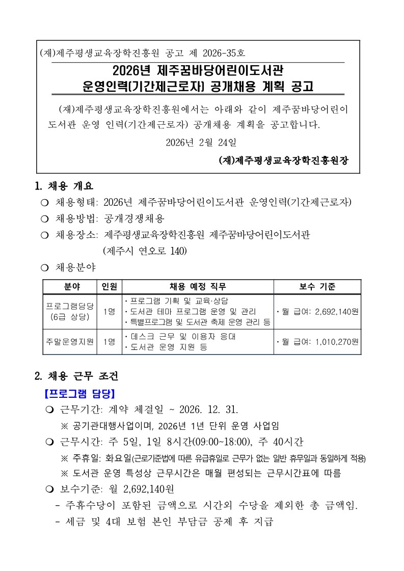 | 제 목 | 2026년 제주꿈바당어린이도서관 운영인력(기간제근로자) 공개채용 계획 공고 | ||
