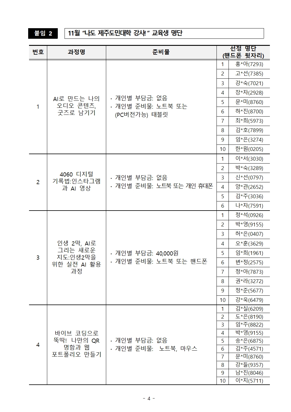 (붙임) 2026년 「제주도민대학」 3월 나도 제주도민대학 강사 교육 과정 개설 및 교육생 선정 결과 공고.pdf (276 KBytes)