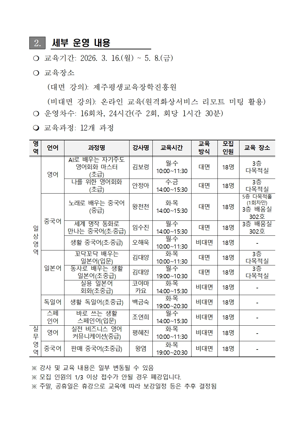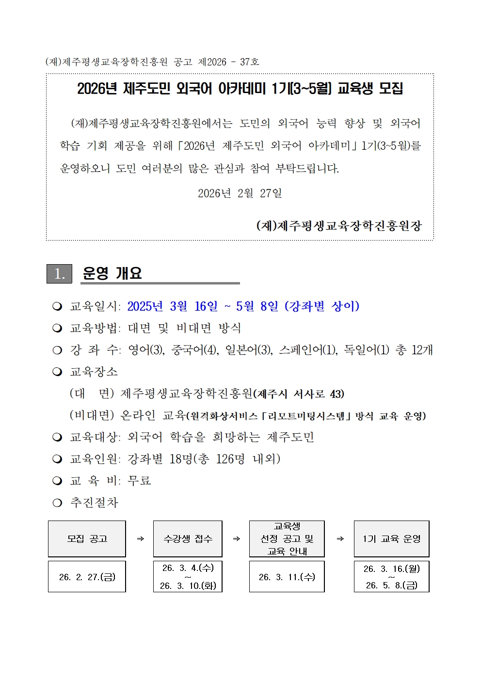 | 제 목 | 2026년 제주도민 외국어 아카데미 1기(3월 ~ 5월) 교육생 모집 | ||