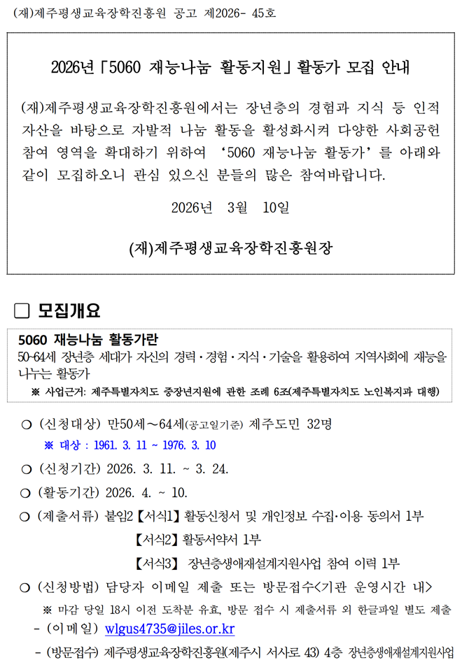 | 제 목 | 2026년「5060재능나눔 활동지원사업」활동가 모집 안내 | ||