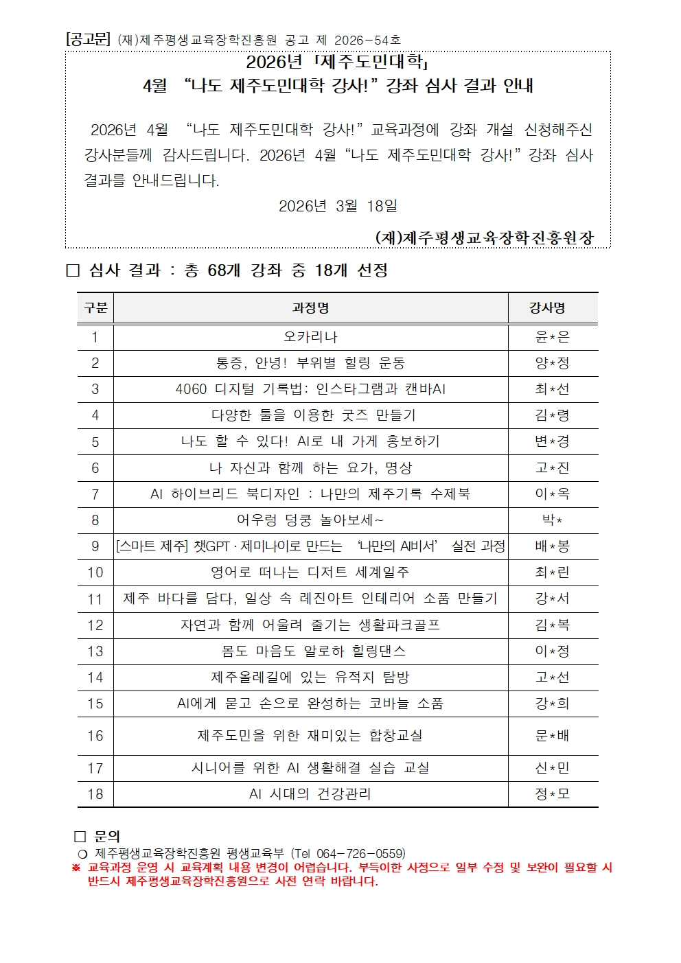 4월 「나도 제주도민대학 강사!」 강좌 심사 결과 안내