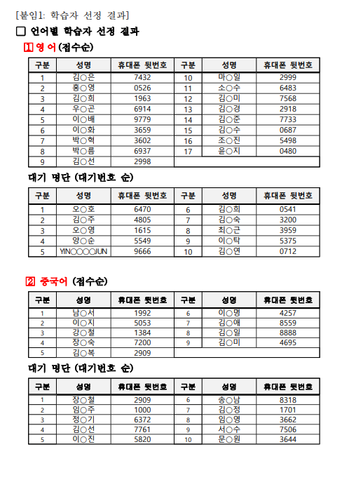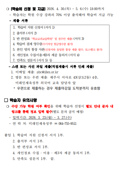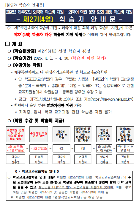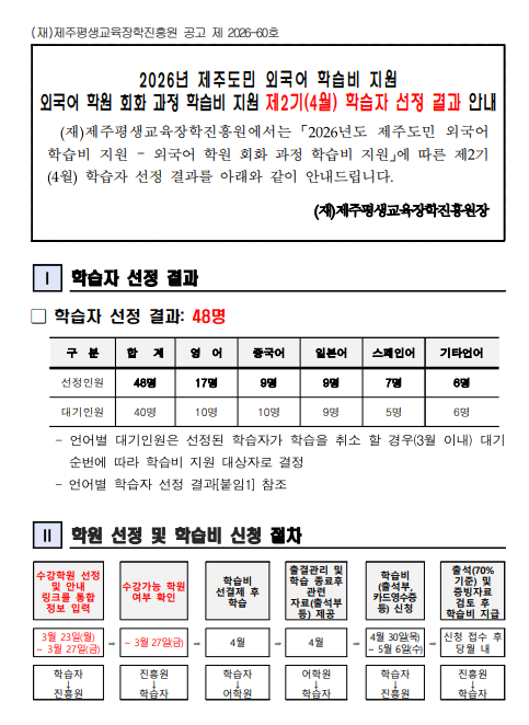 | 제 목 | 2026년 제주도민 외국어 학습비 지원 외국어 학원 회화 과정 학습비 지원 제2기(4월) 학습자 선정 결과 안내 | ||