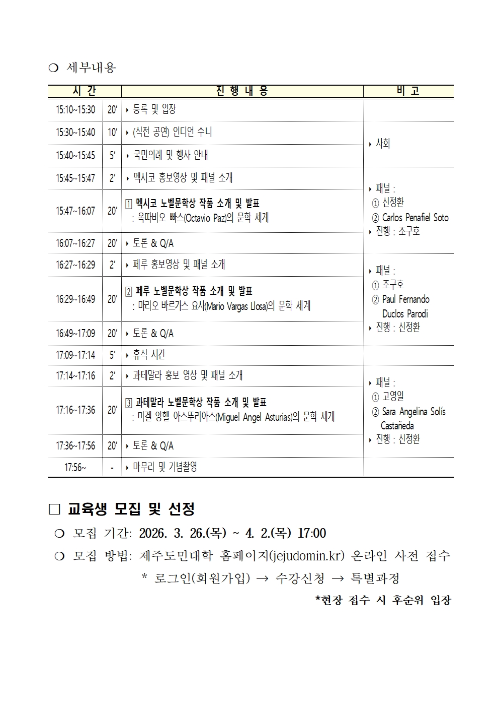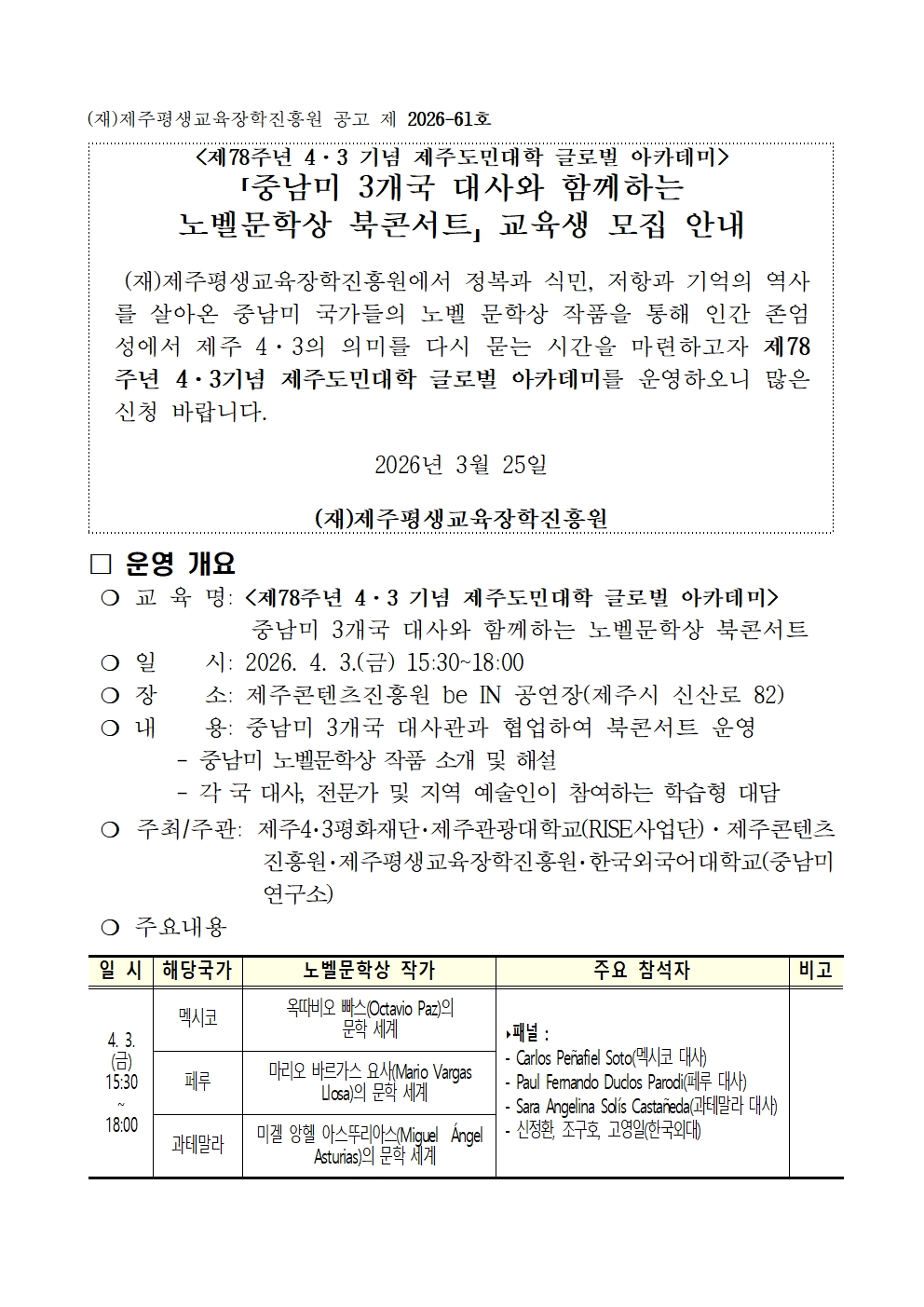 | 제 목 | 제78주년 4·3 기념 제주도민대학 글로벌 아카데미 ⸢중남미 3개국 대사와 함께하는 노벨문학상 북콘서트⸥ 교육생 모집 안내 | ||