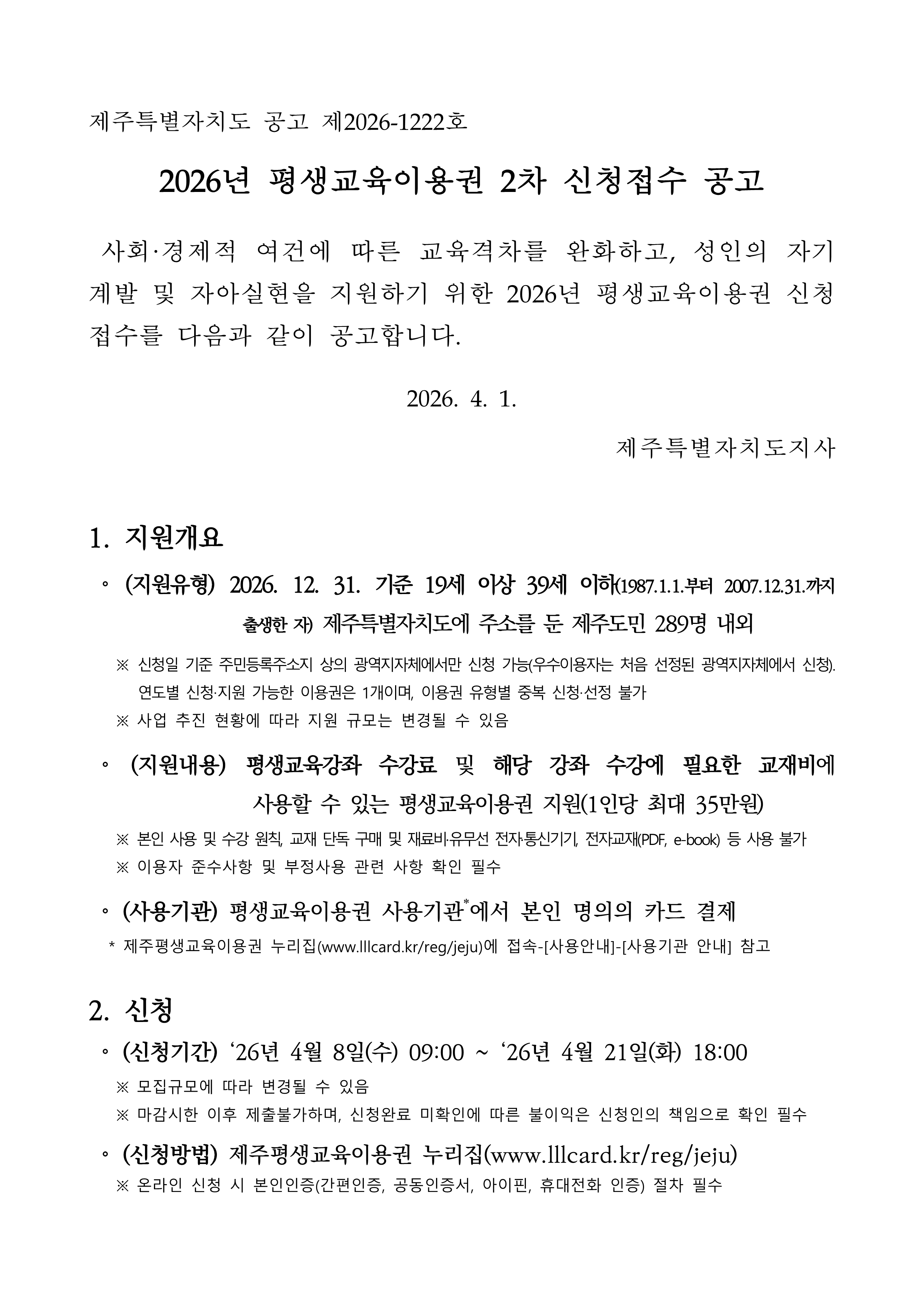 | 제 목 | 2026년 평생교육이용권 2차 신청접수 공고 | ||