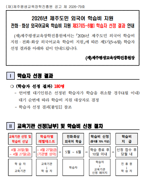 | 제 목 | 2026년 제주도민 외국어 학습비 지원 - 전화 화상 외국어교육 학습비 지원 제3기(5~6월) 학습자 선정 결과 안내 | ||