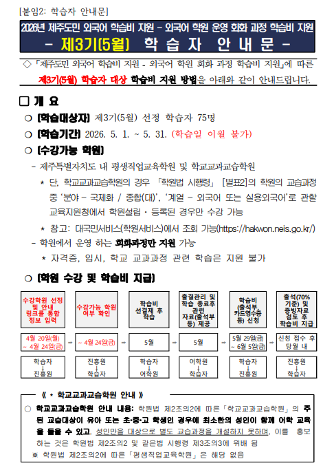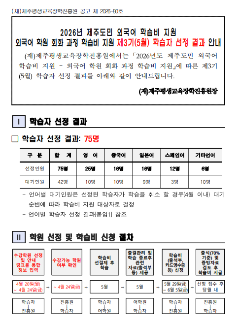 | 제 목 | 2026년 제주도민 외국어 학습비 지원 - 외국어 학원 회화 과정 학습비 지원 제3기(5월) 학습자 선정 결과 안내 | ||