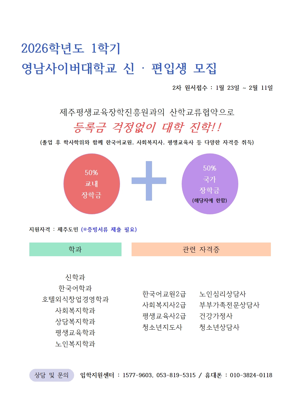 | 제 목 | 영남사이버대학교 2026년 1학기 신·편입생 모집 | ||